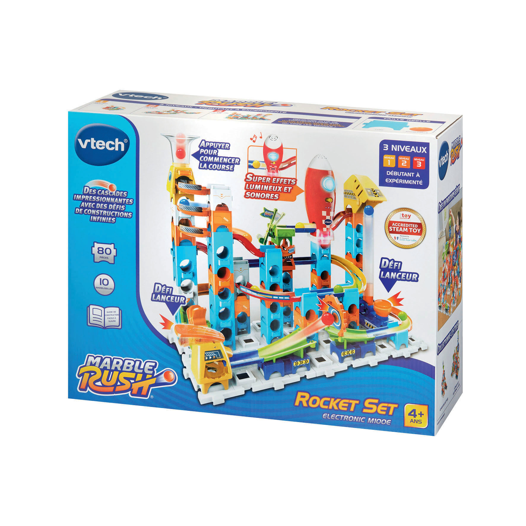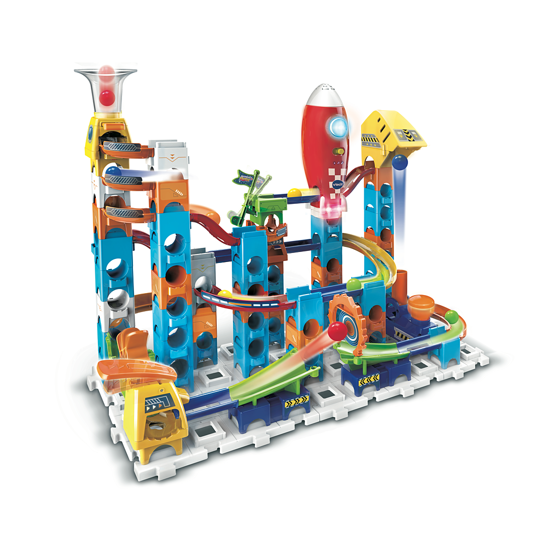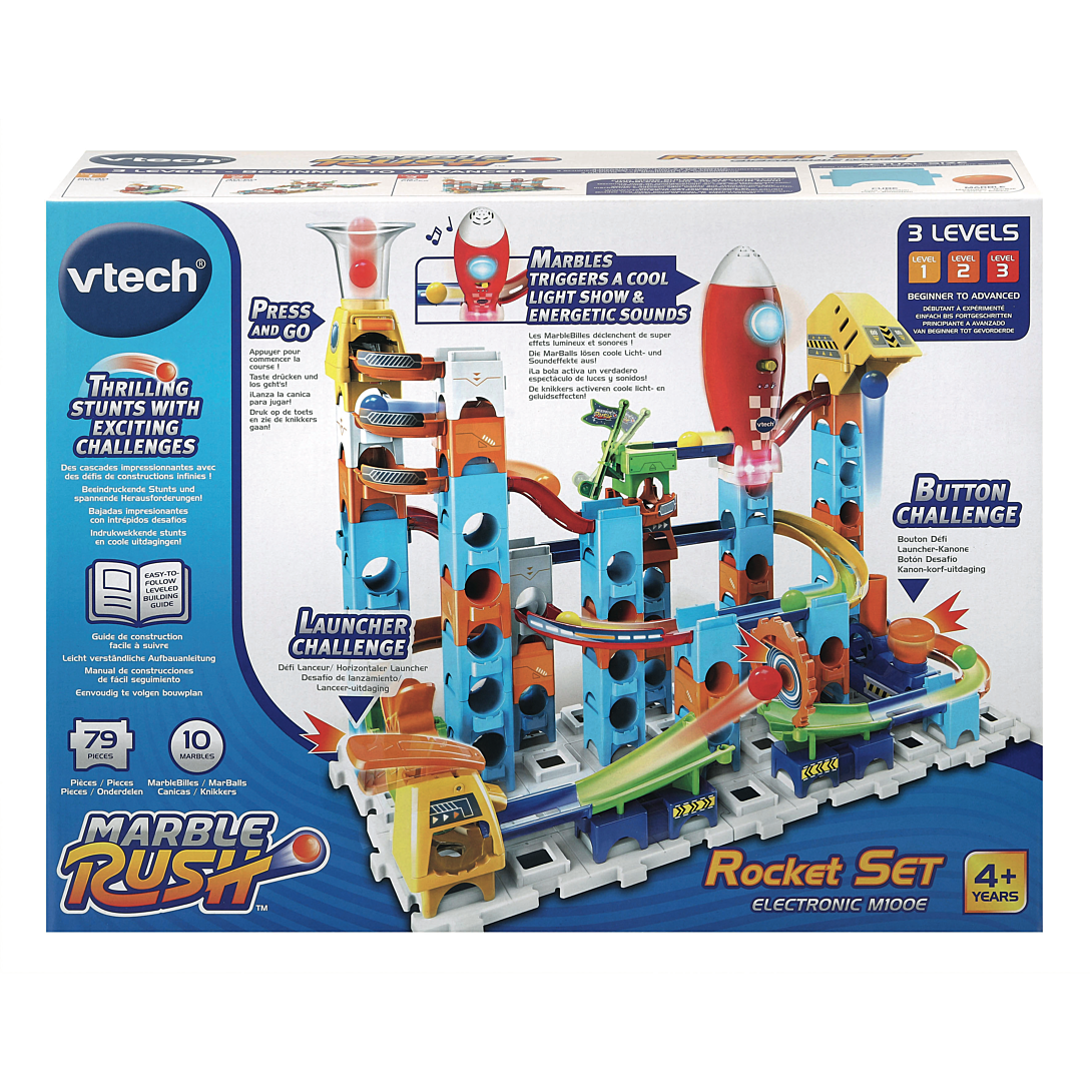 Marble Rush - Circuit à billes - Rocket Set Electronic M100E - 4 ans + 80 pièces et 10 MarbleBilles incluses pour créer un super circuit sur le thème de l’espace. Un lanceur pour projeter les billes horizontalement et leur permettre d’atteindre la cible ! Une projection verticale pour permettre aux MarbleBilles d’atteindre les sommets. Génial ! La fusée interagit lors des passages des MarbleBilles en émettant des sons et des lumières. Une zone de lancement pour projeter les MarbleBilles à toute vitesse ! De nombreux passages secrets, aiguillages et zones d’interactions. L’enfant développe sa motricité, sa créativité, sa logique et son imagination en créant des combinaisons à l’infini ! Compatible avec les autres sets de la gamme. Arrêt automatique. Boîte fermée. Fonctionne avec 2 piles LR6/AA fournies.