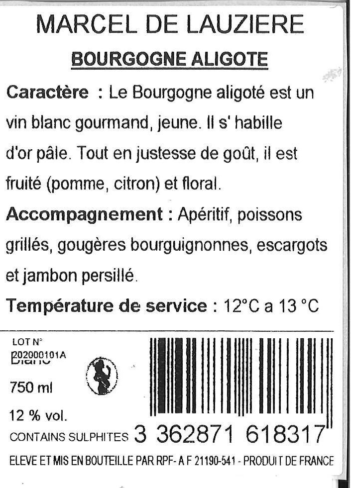 | Libellé | Marcel de Lauzière, 2023 - Bourgogne Aligoté AOP - Blanc Sec - 75 cl |