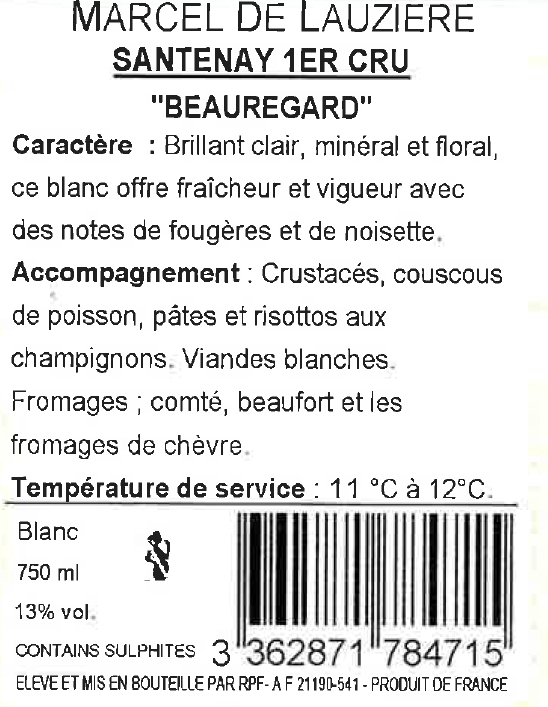 | Libellé | Marcel de Lauzière Beauregard, 2017 - Santenay 1er Cru AOP - Blanc Sec - 75 cl |