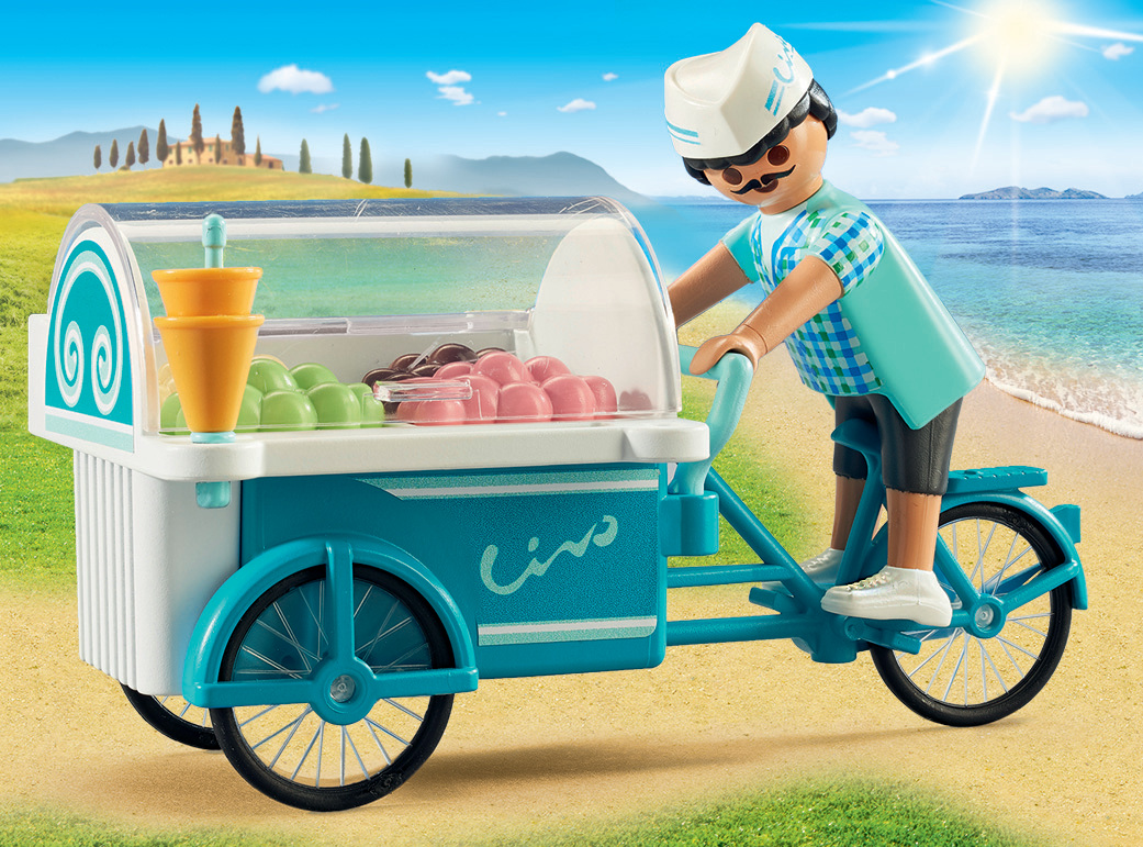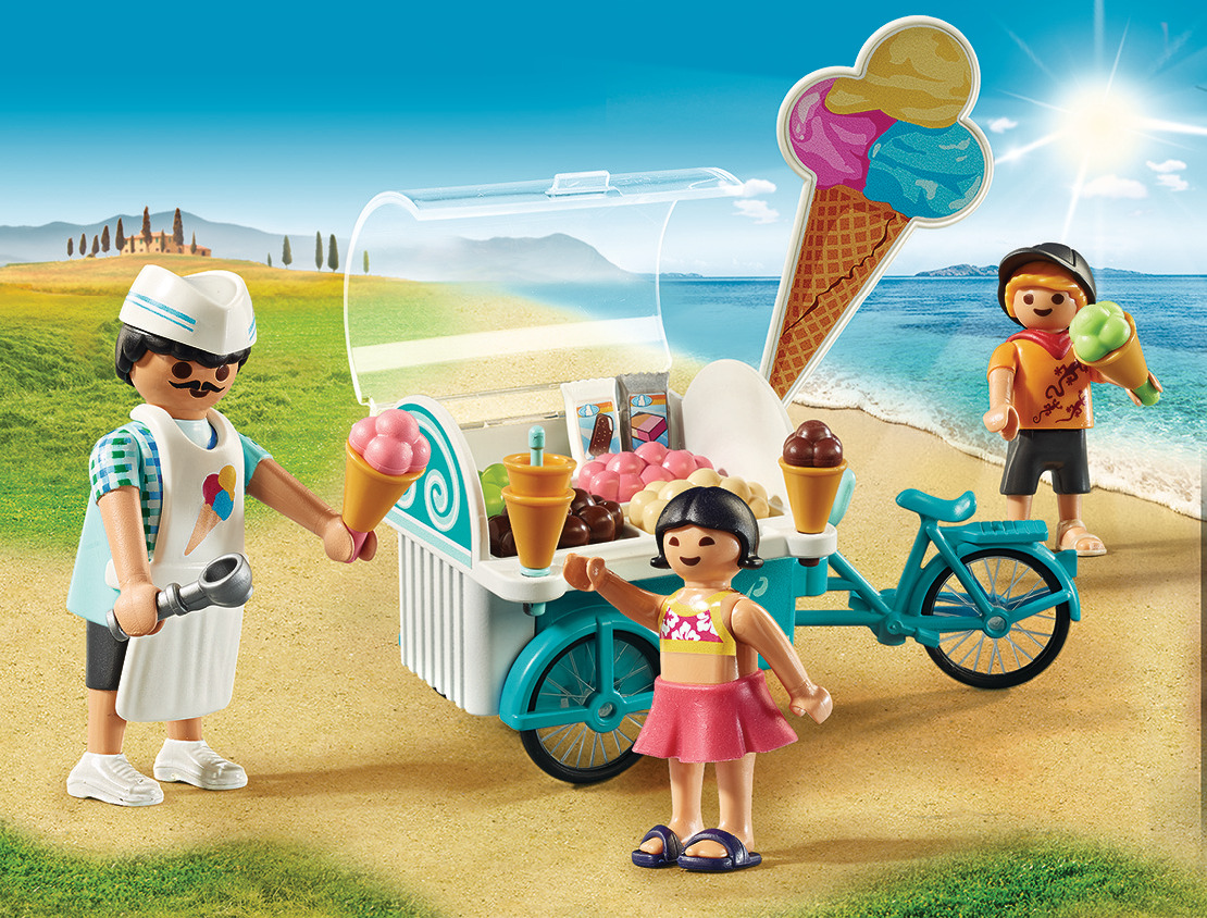 Soleil et air frais : quoi de mieux pour savourer une bonne glace ? Voilà le marchand de glaces qui arrive à point nommé sur son vélo le long de la promenade. Il y a tellement de parfums différents ! Cest difficile de choisir. « Je voudrais un cornet vanille et chocolat », demande la petite fille. « Non, je préfère une glace en pot », décide le garçon. Quel que soit le parfum, toutes les glaces sont délicieuses !