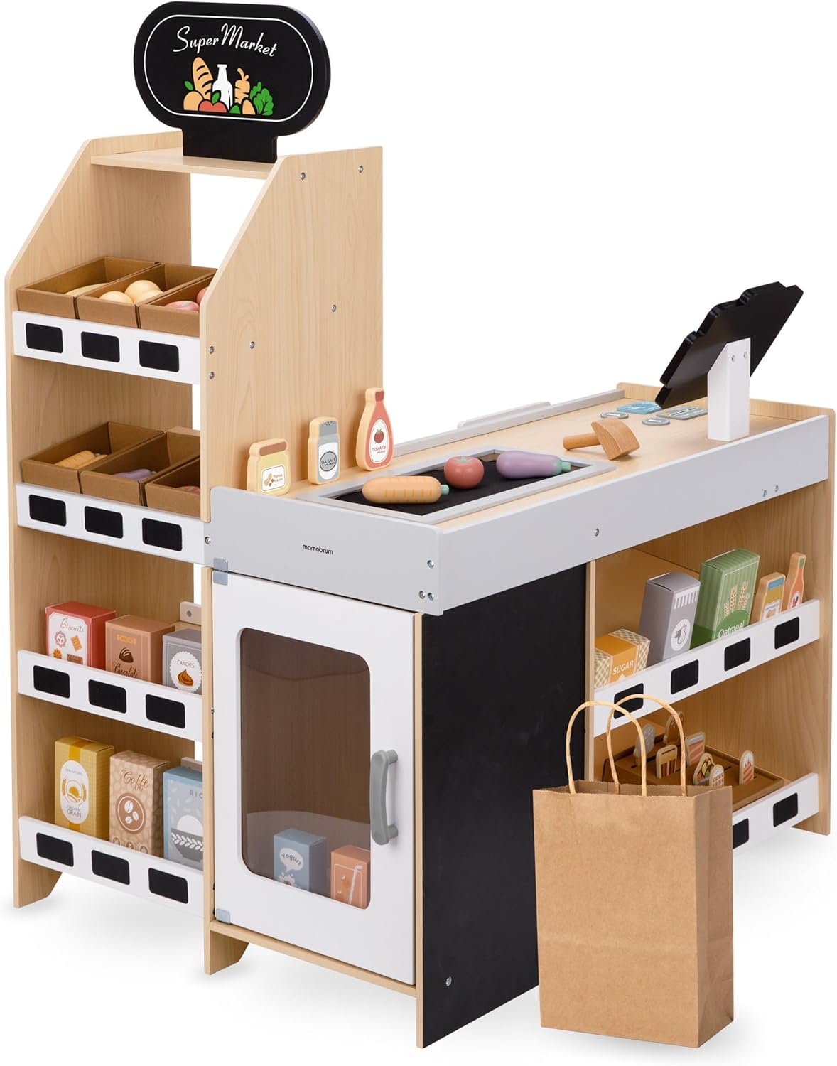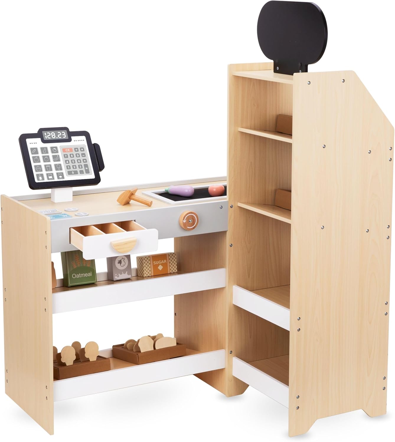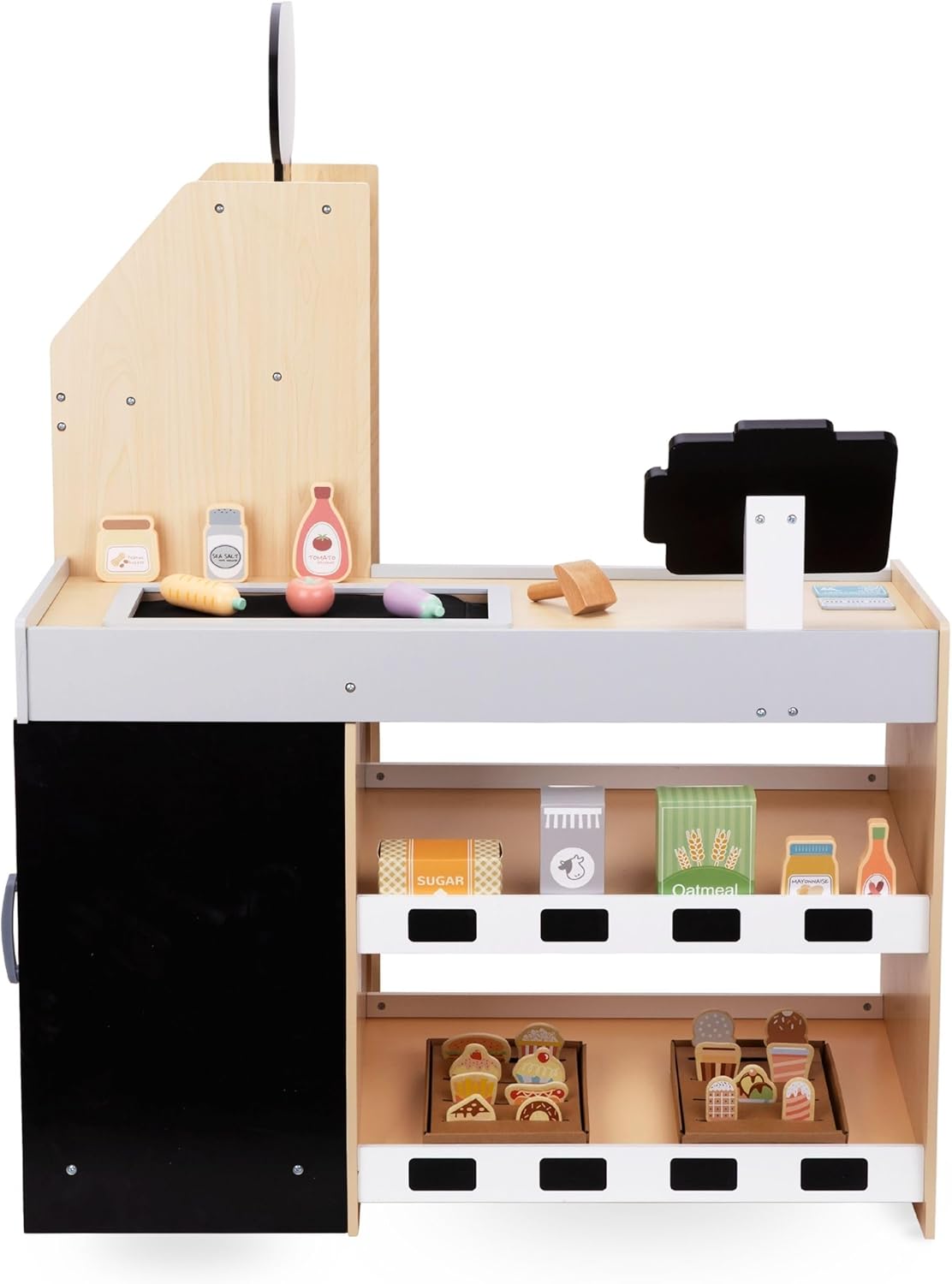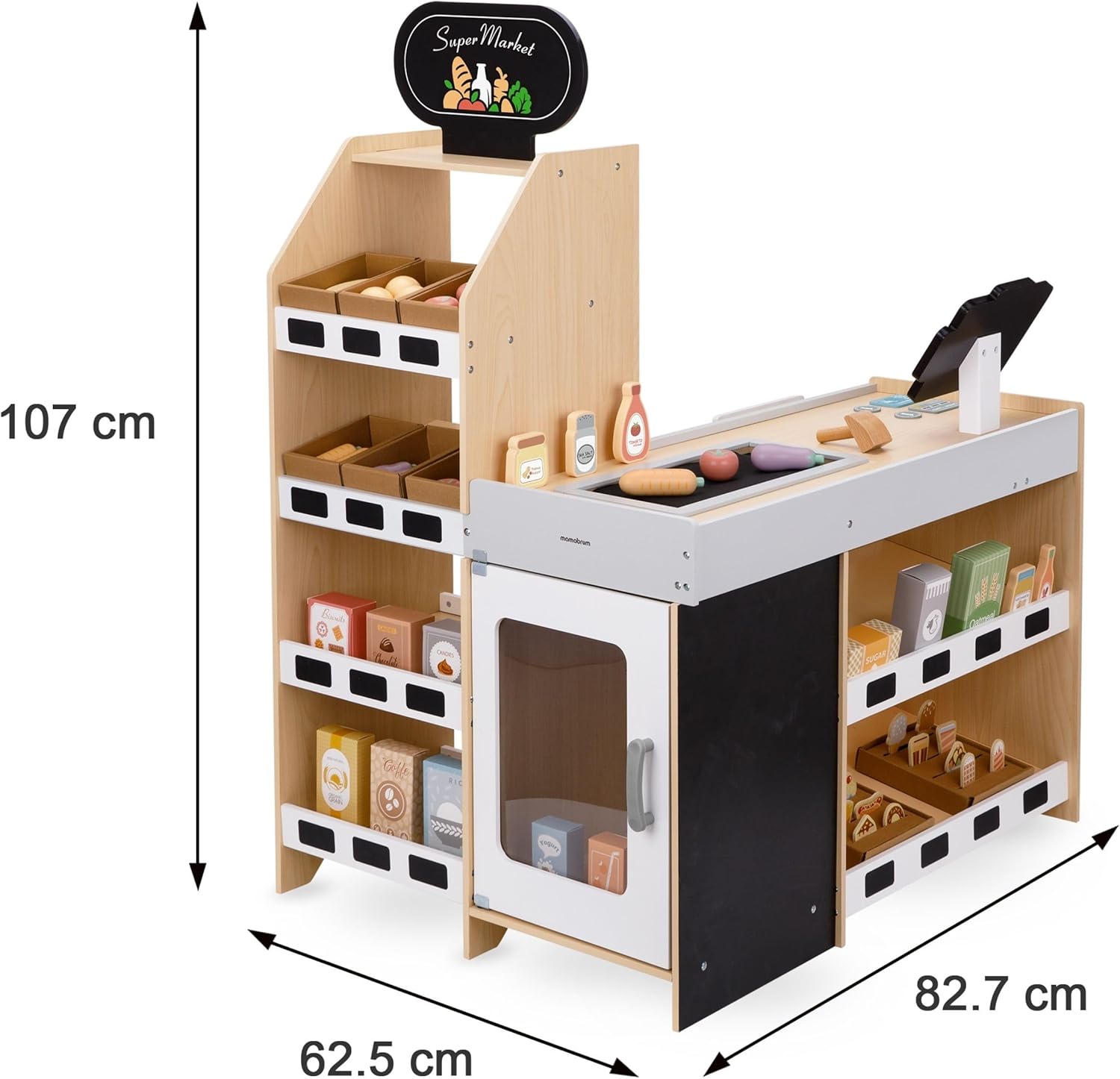De nombreuses étagères pour présenter les marchandises permettent au petit commerçant de trier les produits et de les ranger confortablement. Grâce au support solide et à l'équipement complet de l'échoppe en bois, votre enfant peut jouer le rôle du commerçant ou du client et offrir un divertissement unique et créatif.