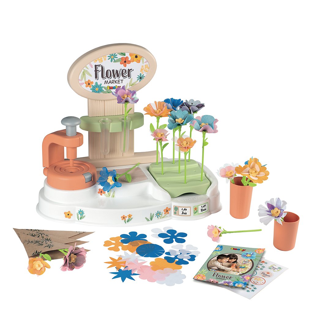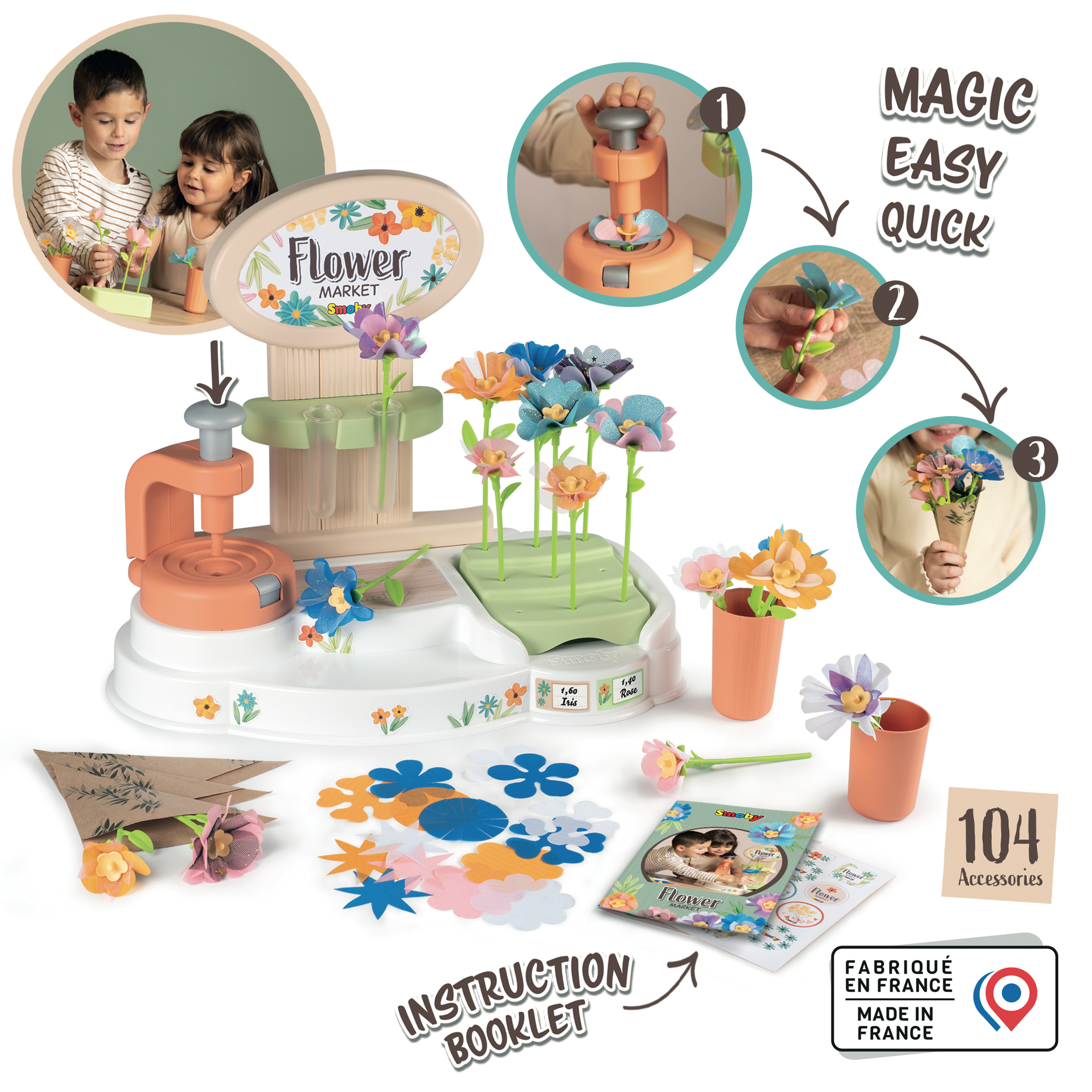 Avec ton Marché aux fleurs tu vas pouvoir réaliser tes propres fleurs, et les offrir a tes parents et tes amis. Réalise facilement et rapidement tes bouquets grâce à ta fabrique de fleurs. Tu retrouveras tout le nécessaires pour réaliser les fleurs que tu aimes. Plus de 100 accessoires inclus. A partir de 3 ans. Fabrication française.