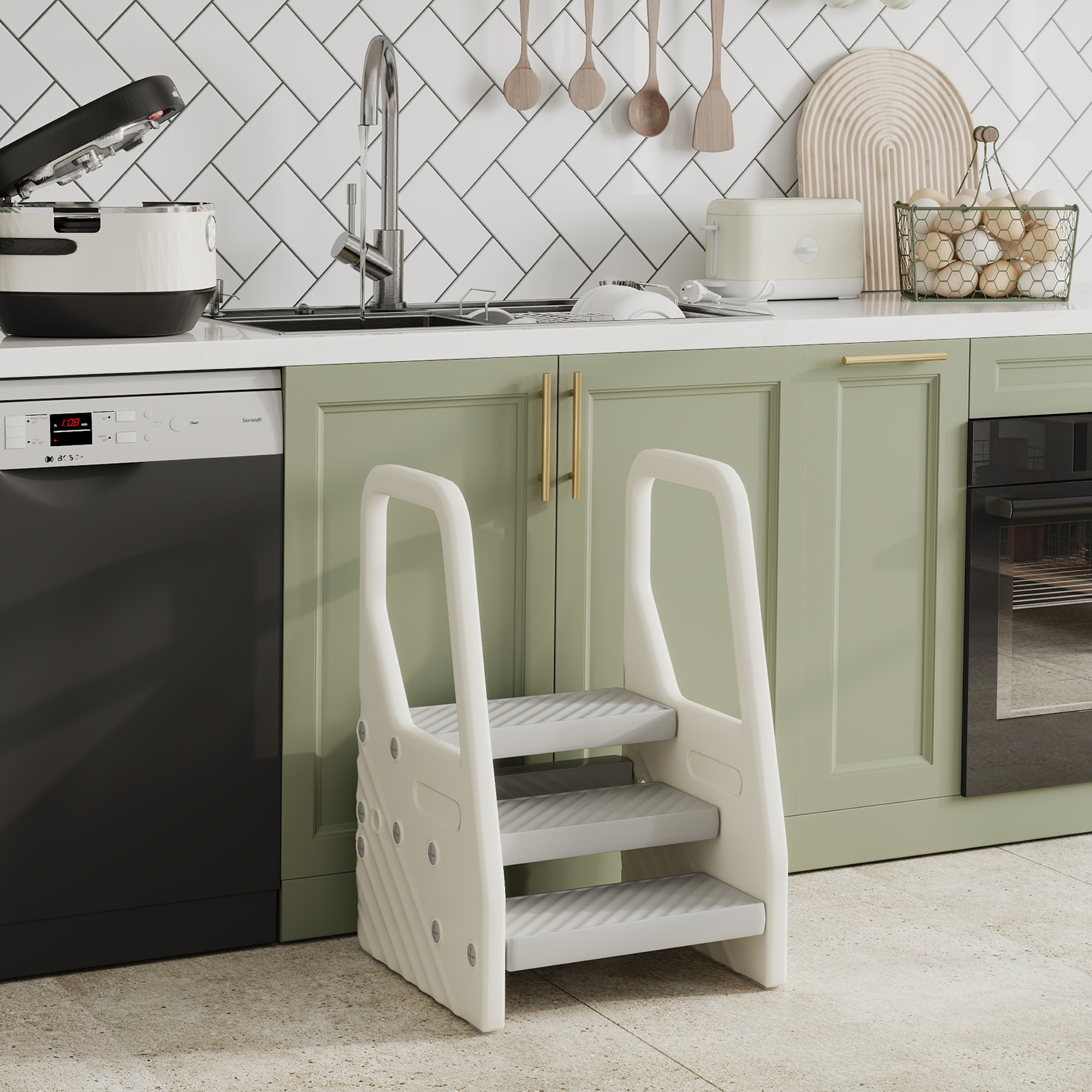 Marchepied enfant hauteur réglable - 2 ou 3 marches antidérapantes, poignées - HDPE crème gris