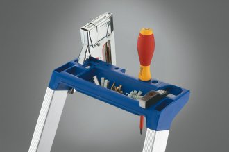 • Porte-outils avec crochet porte-seau intégré et logement pour perçeuse.