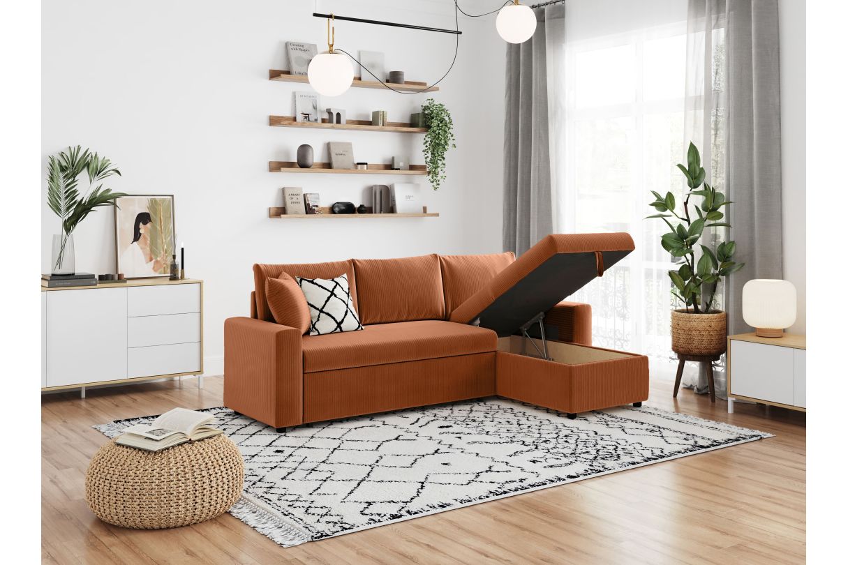MARIA - Canapé d'angle réversible, convertible en velours côtelé avec coffre - Terracotta