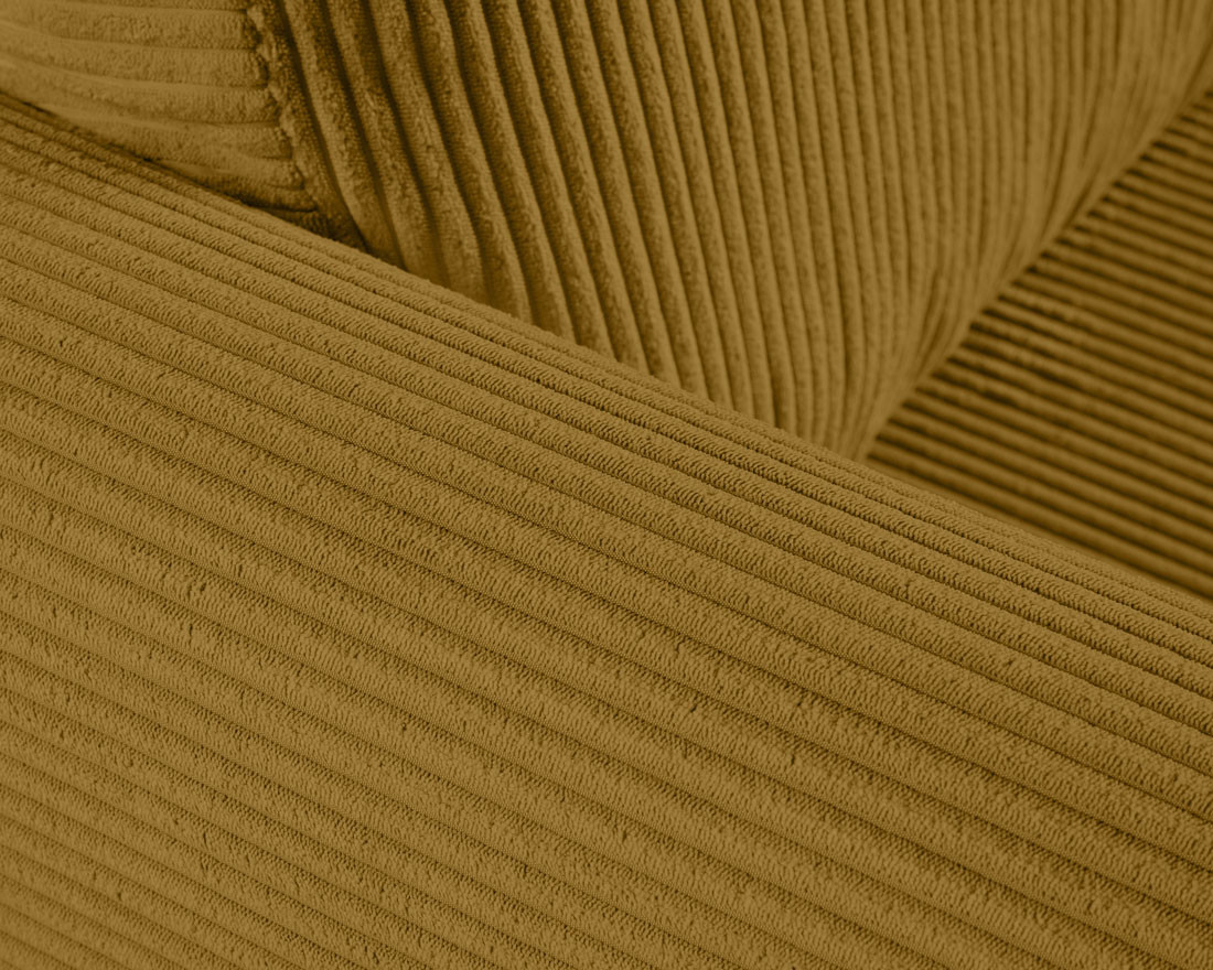 - Détail des matières : Assise : Mousse polyuréthane de densité 30Kg/m3m3 - Coussins : Flocons de mousse – Structure : Bois et panneaux de particules - Revêtement en velours côtelé 100% polyester - Pieds en plastique