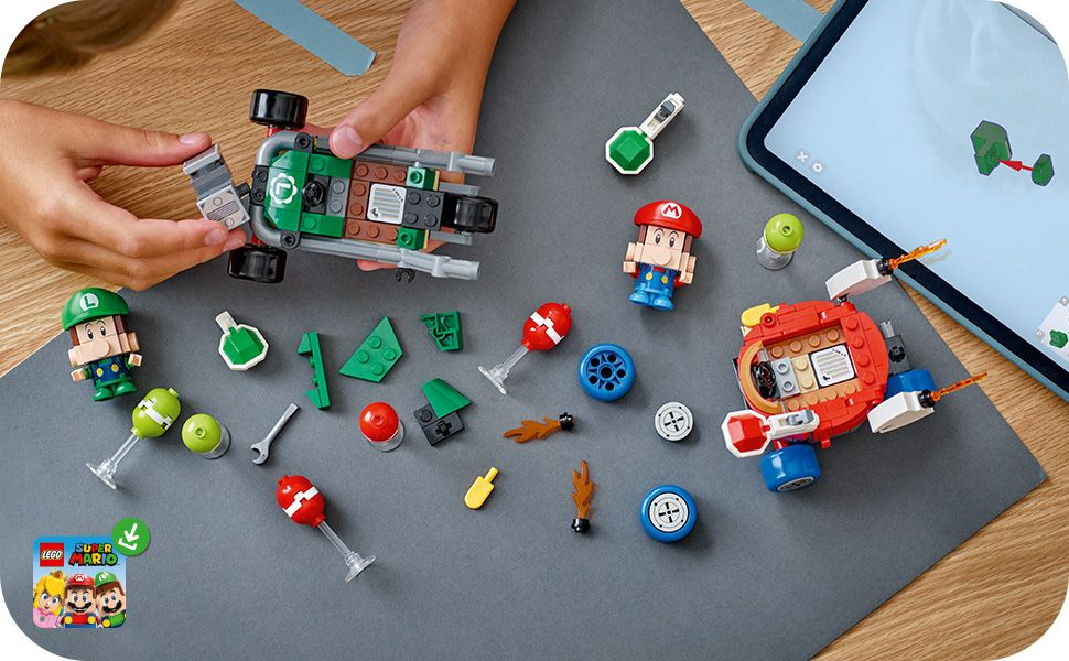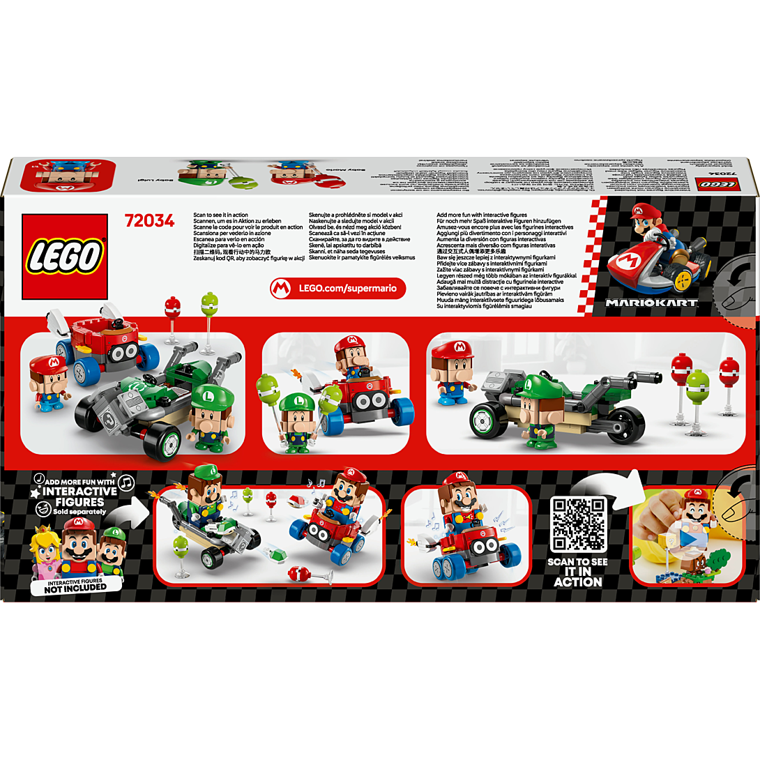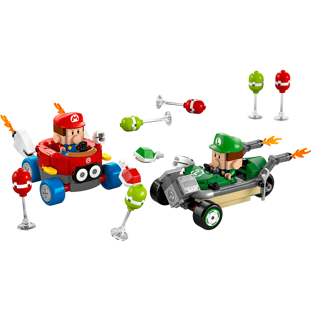 Faites exploser des ballons et jouez à la course avec Bébé Mario contre Bébé Luigi (72034). Belle idée de cadeau d’anniversaire Mario Kart™ pour les garçons, les filles et les passionnés de jeu vidéo dès 8 ans, ce set inclut 2 figurines Nintendo® à collectionner - Bébé Mario et Bébé Luigi - accompagnées des véhicules Paracoccinelly et Tubul R3. Chaque voiture à construire peut lancer des carapaces sur 6 ballons (3 rouges et 3 verts). Qui sera le premier à faire éclater ses ballons ? Placez une figurine LEGO® Mario™, LEGO® Luigi™ ou LEGO® Peach™ (incluse dans le set 71439, 71440 ou 71441, vendu séparément) dans l’un des karts pour un jeu interactif. Vous déclencherez ainsi des effets sonores/visuels de Mario Kart au départ de la course etlorsque vous klaxonnez et dérapez. Retrouvez les instructions de ce set Nintendo dans l’appli LEGO® Super Mario™ et jetez un œil aux autres sets LEGO Super Mario : Mario Kart (vendus séparément) pour découvrir d’autres personnages et véhicules.
