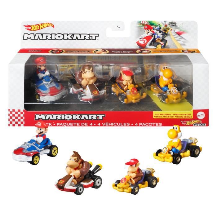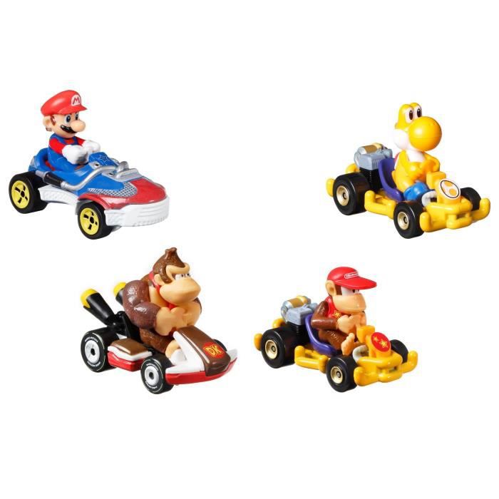 Libellé Mario Kart - Pack 4 véhicules métal Hot Wheels 1/64 Mario, Donkey Kong, Diddy Kong, Orange Yosh