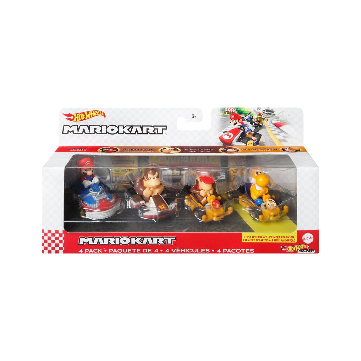 Pack de 4 véhicules métal Mario Kart Hot Wheels 1/64 Mario, Donkey Kong, Diddy Kong, Orange Yoshi.