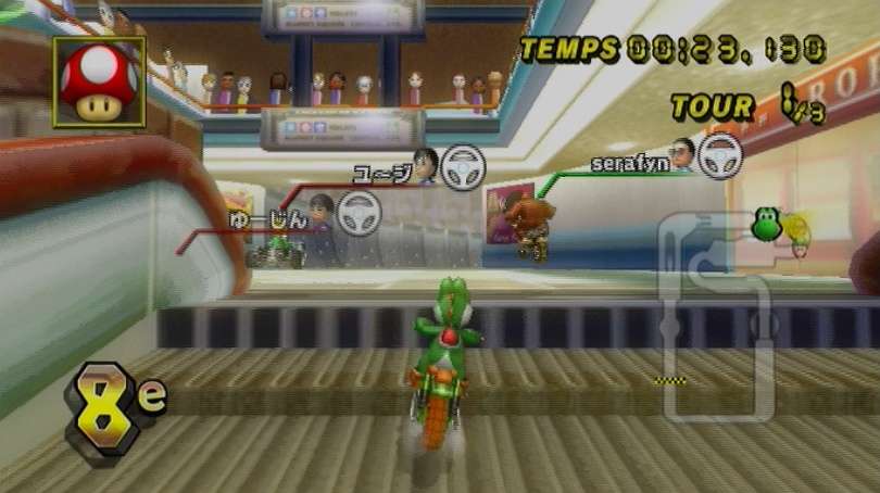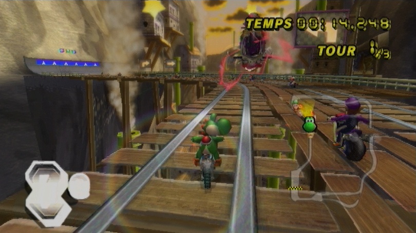 Grâce au volant accessoire Wii Wheel non inclus, permettant de ressentir toutes les sensations des courses survoltées, les joueurs peuvent découvrir un Mario Kart nouvelle génération, intuitif comme jamais. Mario Kart Wii dépasse les frontières et vous emmène dans des compétitions effrénées à l'échelle mondiale ! En kart et désormais en moto, affrontez et explosez vos concurrents afin d'afficher votre Mii à la tête des classements mondiaux ! Affûtez vos carapaces et préparez vos réserves de champignons, le championnat mondial Mario Kart sur Wii est lancé !