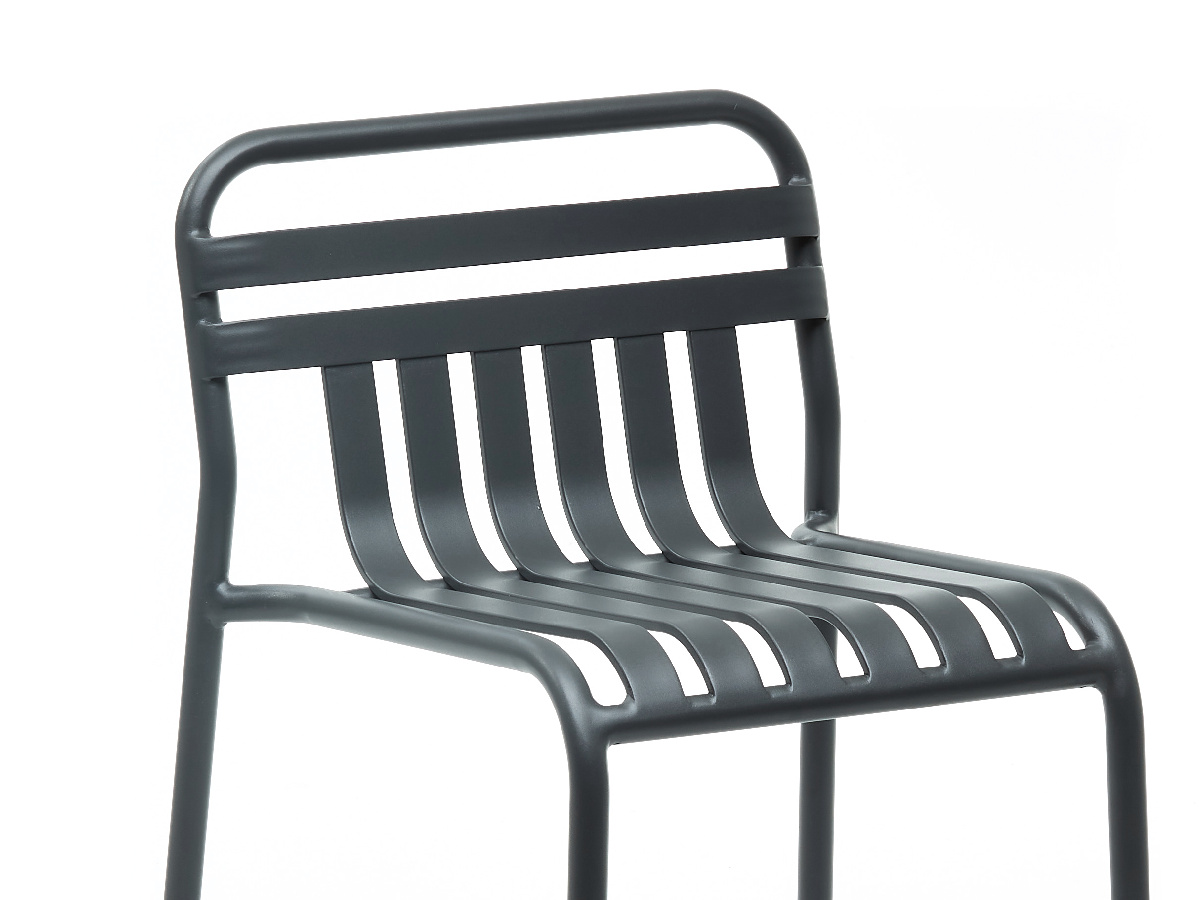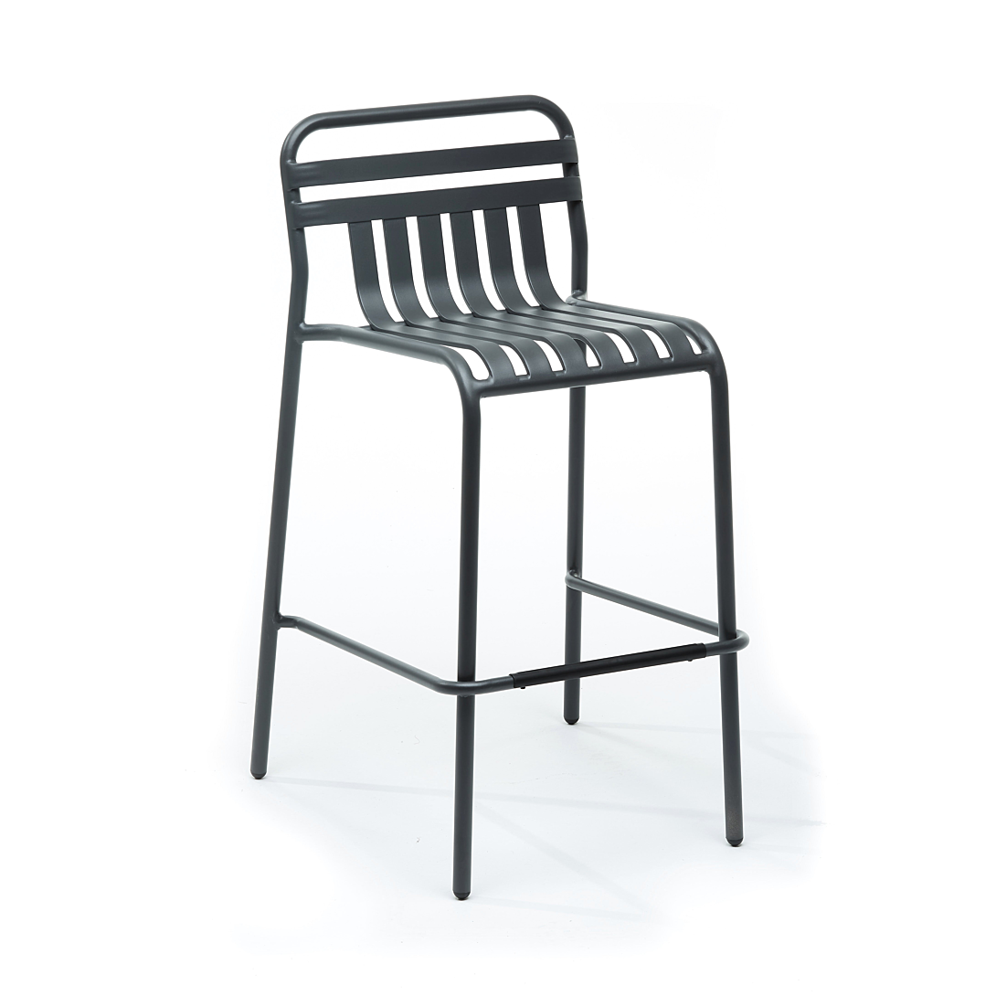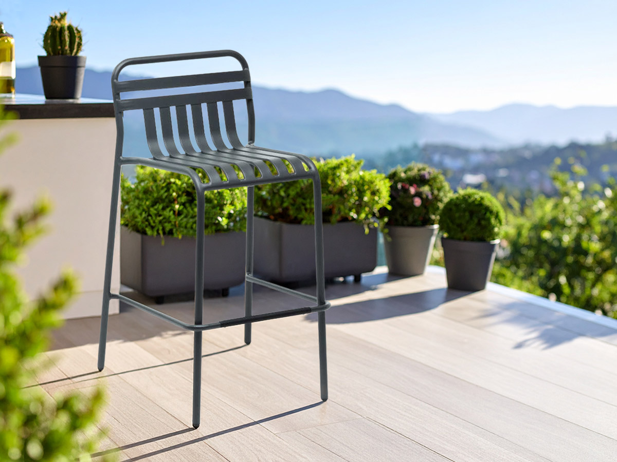 Tabouret haut avec dossier empilables – Aluminium et résine époxy – Couleur : Anthracite – Dimensions : 60 × 60,5 × 100 cm