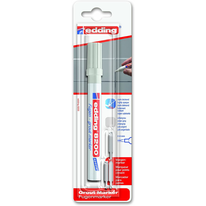 Plus produit Marqueur rénovation joints EDDING 8200 (gris). Encre laquée très couvrante, résistante à l'eau et à l'effacement, sèche rapidement et sans odeur. Pointe ogive 2–4 mm pour application précise. 3 pointes de rechange fournies. Références : ART0009106 / L024024, EAN 4004764895090.