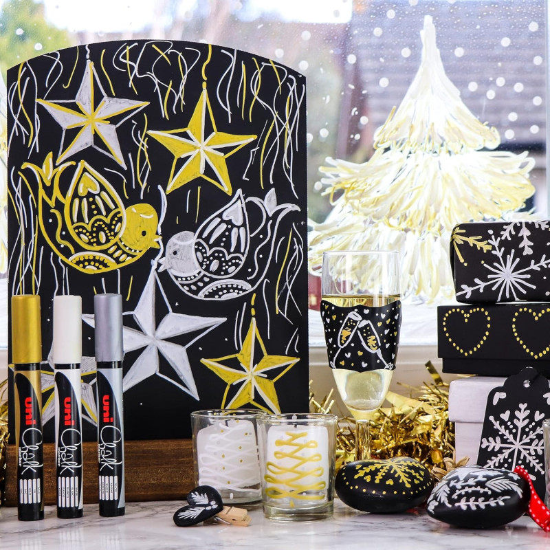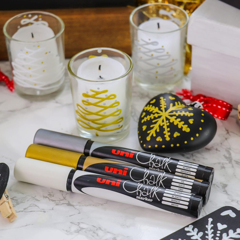 Apportez une touche d'originalité et de clarté à toutes vos créations et affichages grâce aux Marqueurs Craie Uni-Ball Chalk PWE-5M en blanc, argent et or. Conçus pour un usage polyvalent, ces marqueurs offrent un rendu effet craie sans poussière, idéal sur toutes les surfaces non poreuses : ardoises, vitrines, miroirs, fenêtres, panneaux lumineux ou objets décoratifs en verre.