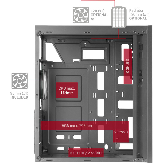 Mars Gaming MC100. Type: PC, Couleur du produit: Noir, Facteur de forme de carte mère supporté: ATX, micro ATX, Mini-ITX. Ventilateurs arrières installés: 1x 90 mm, Pris en charge des diamètres des ventilateurs arrières: 90 mm, Pris en charge des diamètres des ventilateurs supérieurs: 120 mm. Tailles de disques durs supportées: 3.5", Facteur de forme SSD: 2.5". Largeur: 365 mm, Profondeur: 185 mm, Hauteur: 414 mm. Largeur du colis: 405 mm, Profondeur du colis: 222 mm, Hauteur du colis: 458 mm