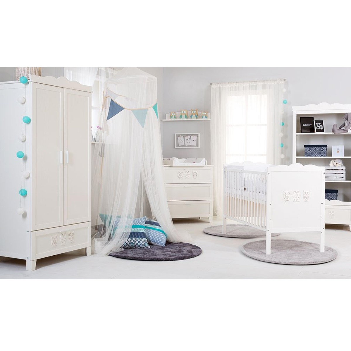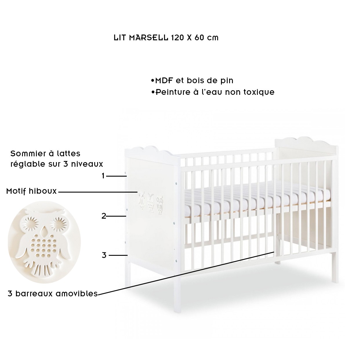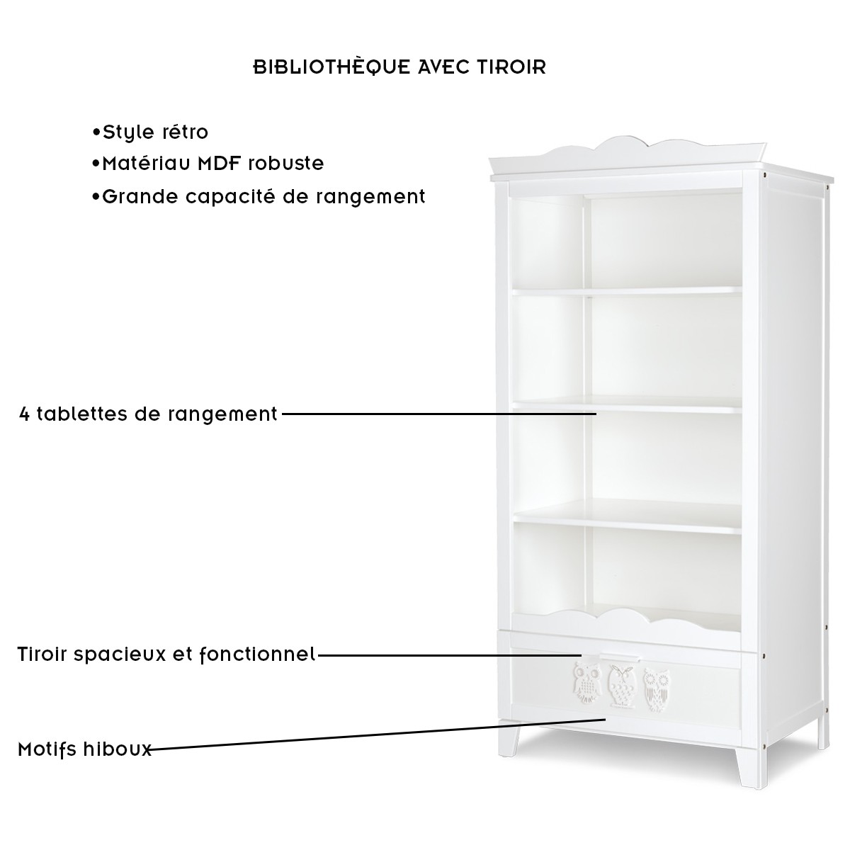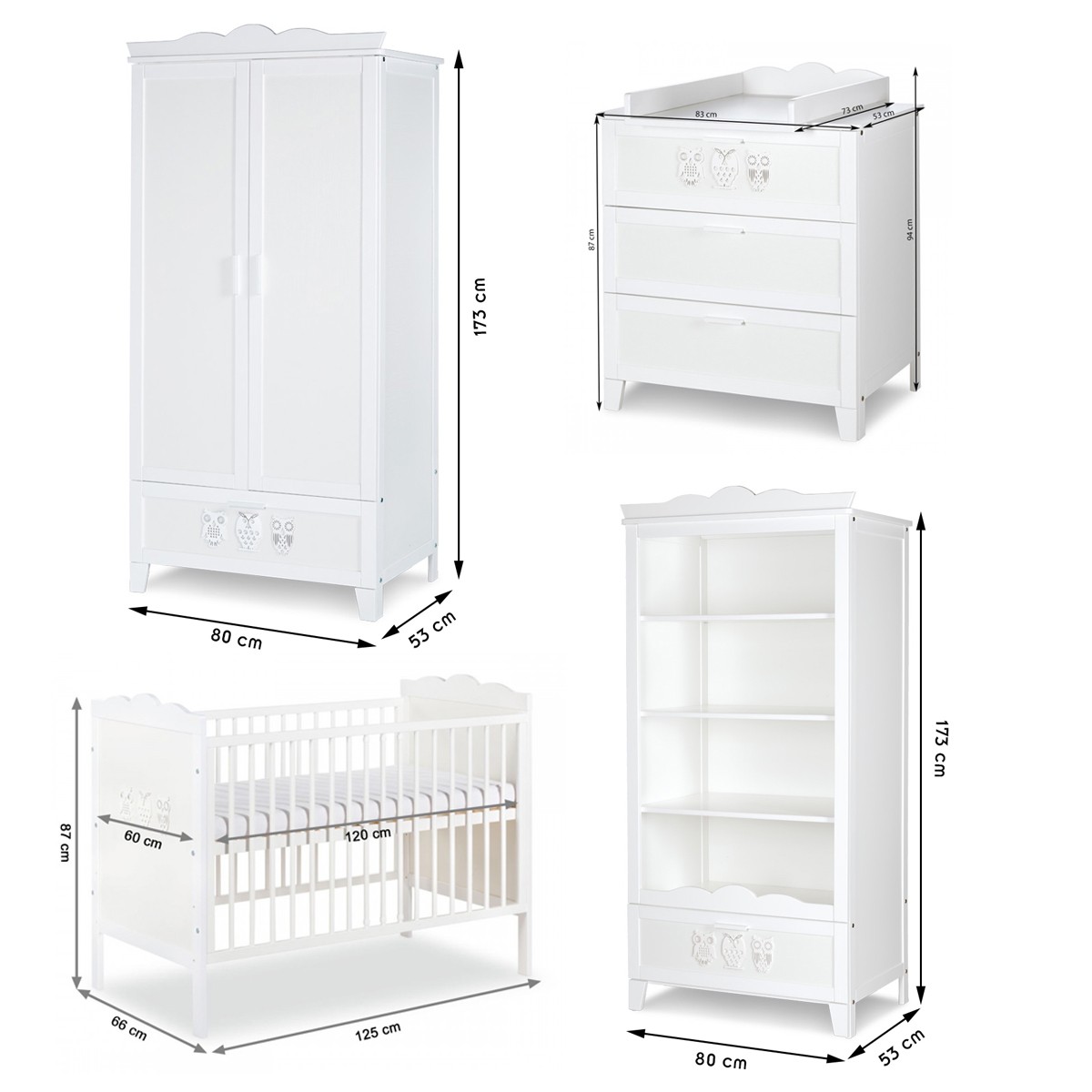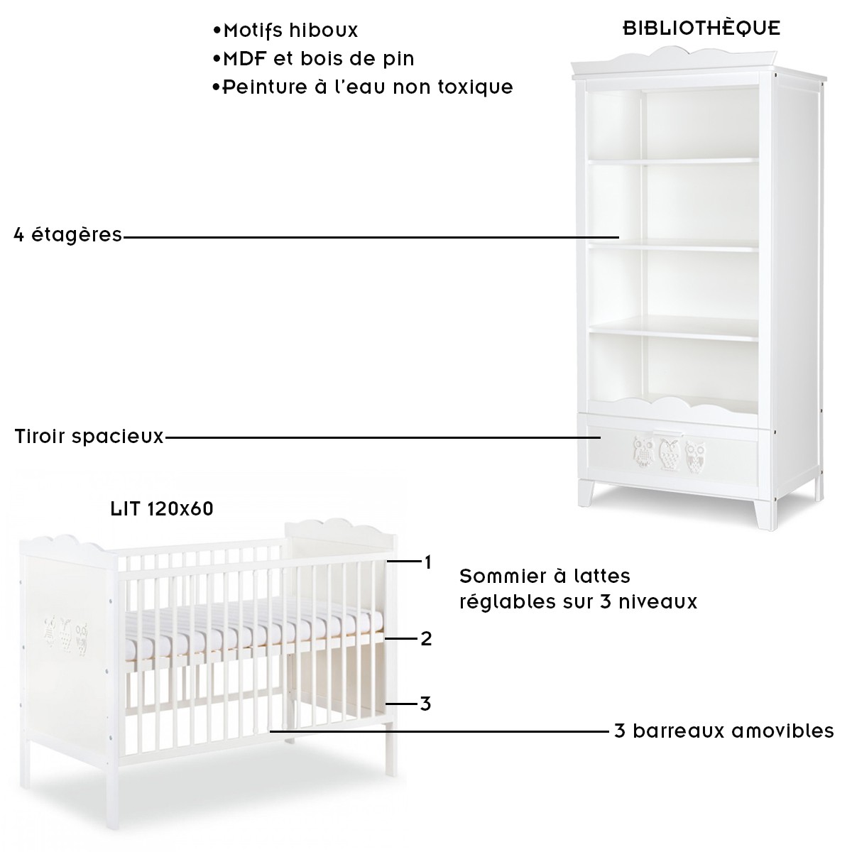 Ensemble de meubles pour chambre enfant CARACTÉRISTIQUES : Cet ensemble aux motifs hiboux, composé d'un lit, d'une commode à langer, d'une armoire et d'une bibliothèque, est parfait pour aménager la chambre de votre enfant dans un style doux et chaleureux. Lit à barreaux 120 cm x 60 cm Il s'adapte à la croissance de l'enfant. Son sommier à lattes est réglable sur 3 niveaux (24, 39 et 54 cm). 3 barreaux sont amovibles. Commode à langer Elle dispose de 3 grands tiroirs. Le plan à langer est amovible. Bibliothèque Elle est composée de 4 étagères et d'un tiroir sur rails coulissants. Armoire Elle est constituée de 4 rayonnages, d'un côté penderie et d'un tiroir en bas. Fabriqué en Union Européenne. Meubles en kit à monter. Peinture à l'eau sans solvant. Matelas non inclus. Meubles fabriqués en MDF, bois de pin et aggloméré. DIMENSIONS ET POIDS : Lit Dimensions extérieures : P 66 X L 125 X H 87 cm. Dimensions intérieures : P 60 X L 120 cm. Poids : 15 kg. Commode Avec table à langer : H 94 X L 83 X P 73 cm. Table à langer : L 70 X l 50 cm. Poids : 42 kg. Bibliothèque Dimensions : L 80 cm x P 53 cm x H 173 cm. Poids : 58 kg. Armoire Dimensions : L 80 cm x P 53 cm x H 173 cm. Poids : 64 kg. À NOTER : pas de livraison en Corse ou sur les îles.
