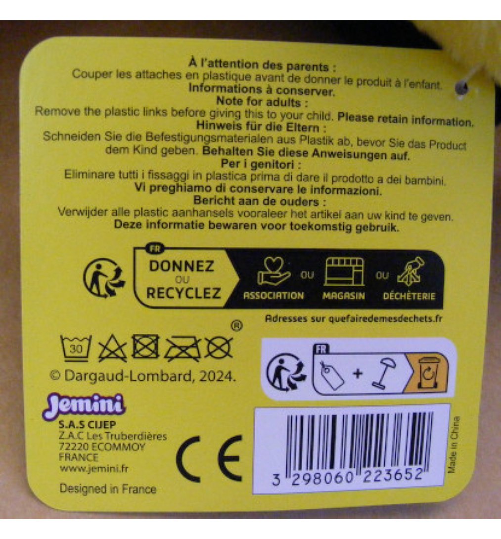 | Avertissements | À l’attention des parents : Couper les attaches en plastique avant de donner le produit à l’enfant. Informations à conserver. |