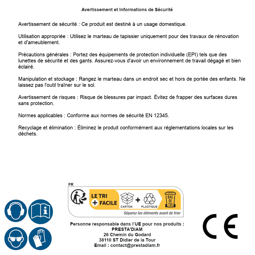Précautions d'utilisationUtilisez toujours des lunettes de protection lors de l'utilisation d'outils. Évitez de frapper des surfaces dures qui pourraient endommager le marteau.