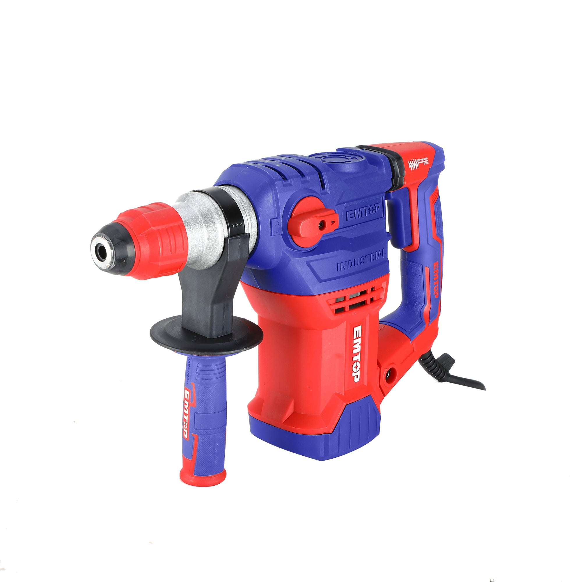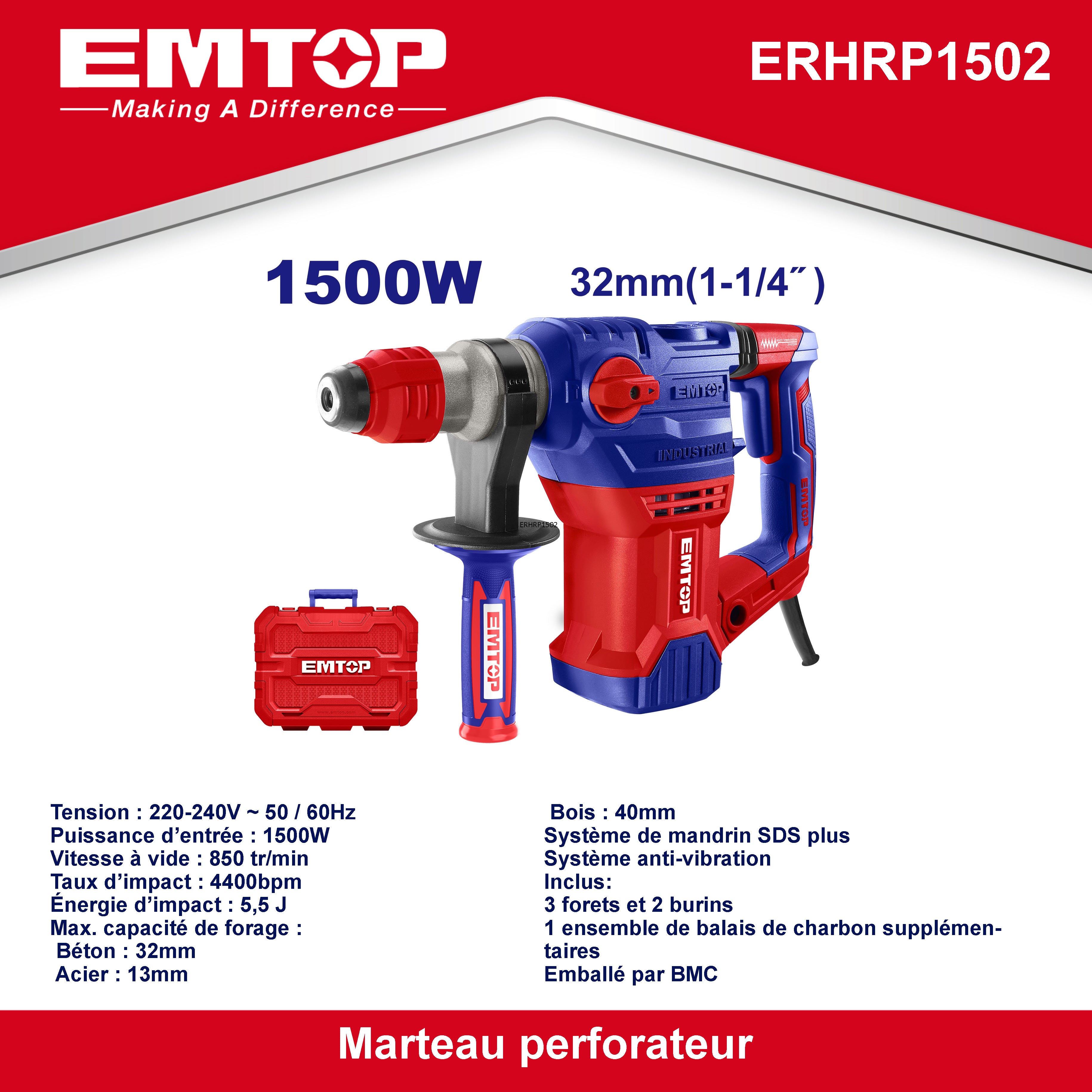 Marteau perforateur filaire 1500W EMTOP Système de mandrin SDS plus anti-vibration avec 3 forets et 2 bur
