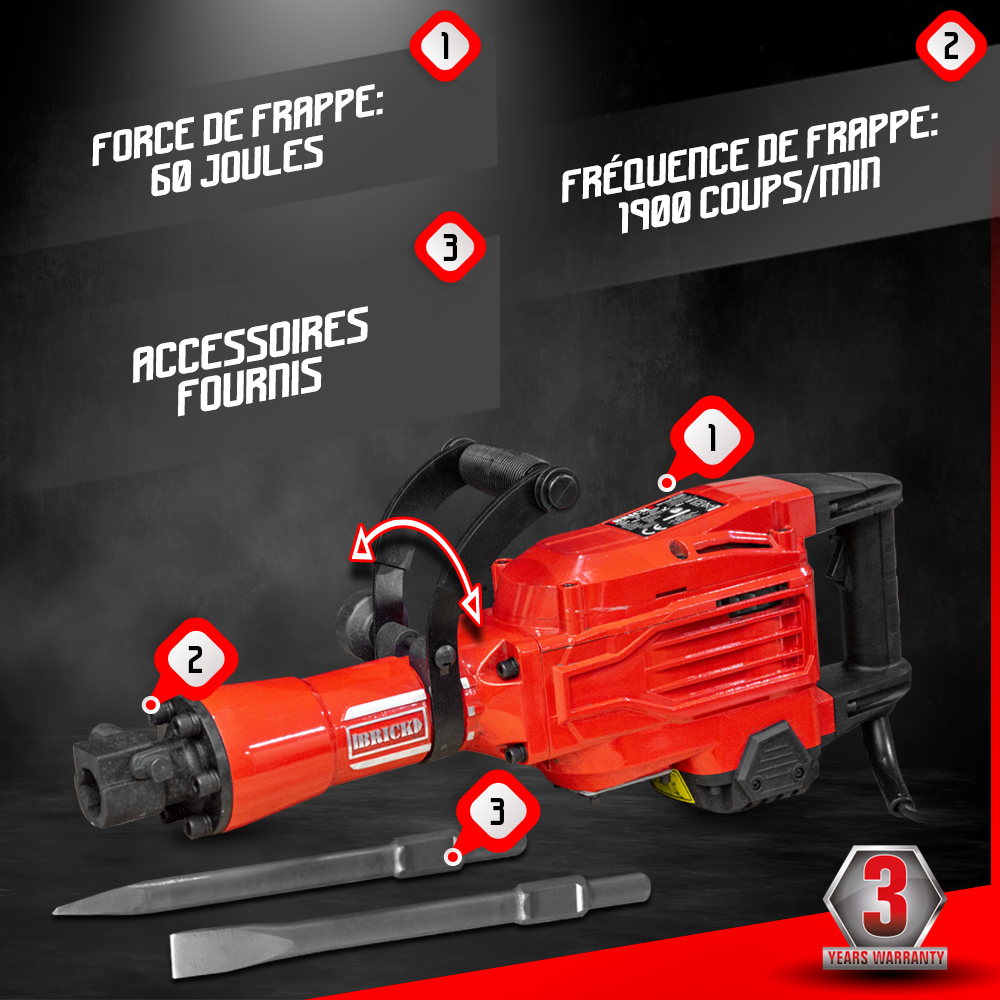 Ce marteau piqueur 1700 W de la marque Brick est prévu pour réaliser des travaux lourds de démolition. Très performant, il permet de briser le bêton sans le moindre effort. Il produit jusqu'à 1900 coups par minute avec une force de frappe impressionnante de 60 joules. Grâce à son design ergonomique vous contrôlez totalement votre machine et pouvez travailler en toute sécurité.