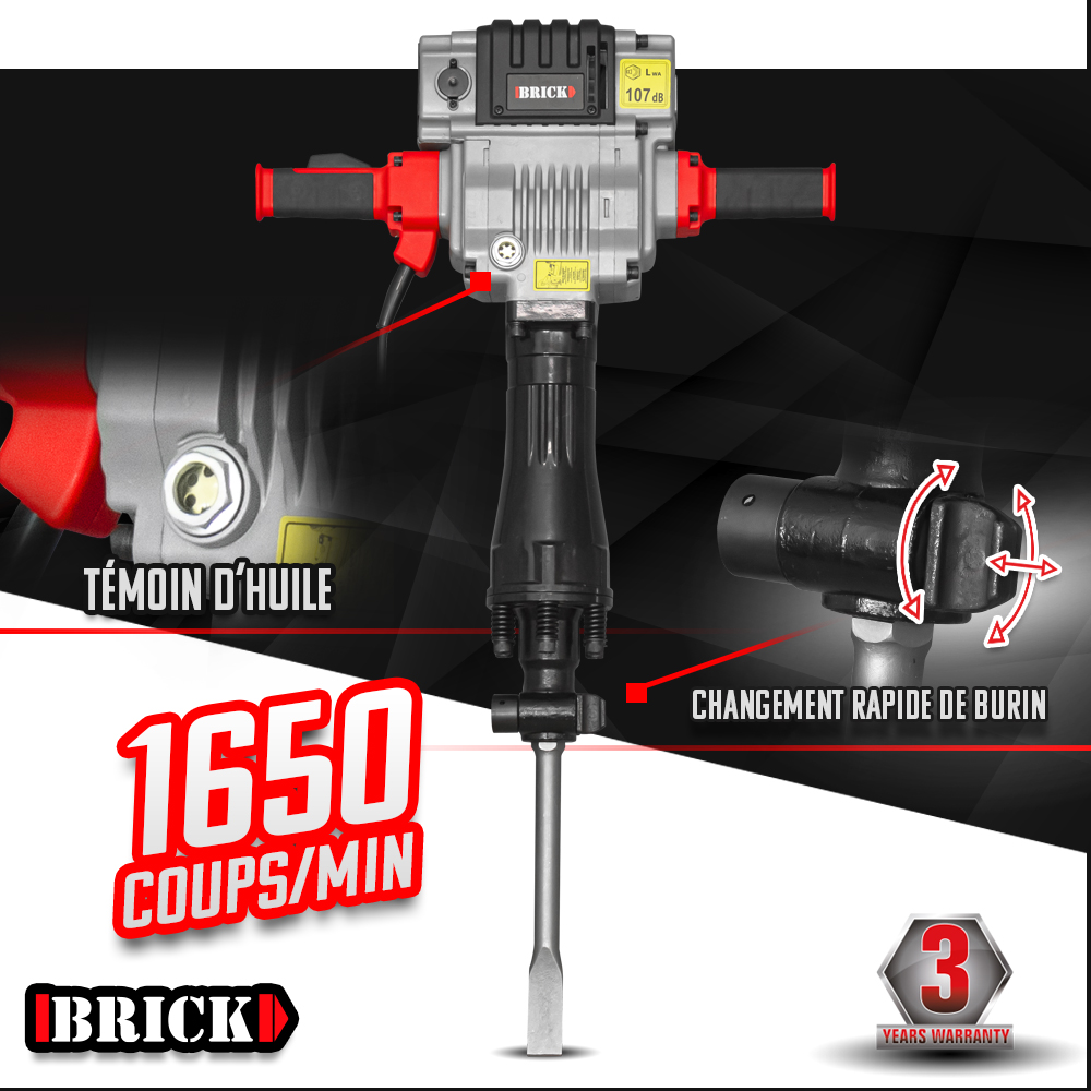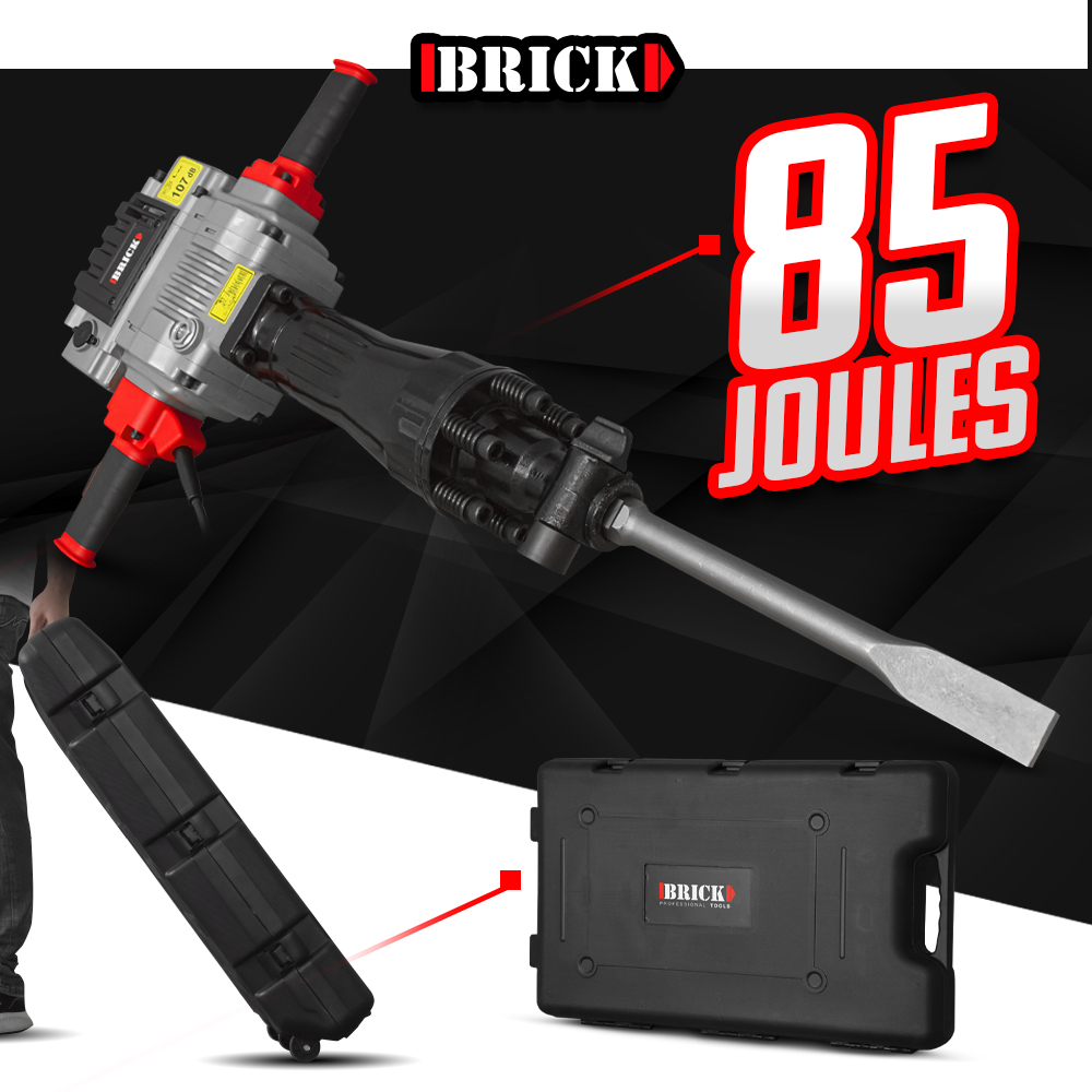 Ce marteau piqueur 2100W Brick est prévu pour réaliser des travaux lourds de démolition. Très performant, il permet de briser le béton sans le moindre effort. Il produit jusqu'à 1650 coups par minute avec une force de frappe impressionnante de 85 joules. Grâce à son design ergonomique vous contrôlez totalement votre machine et pouvez travailler en toute sécurité.