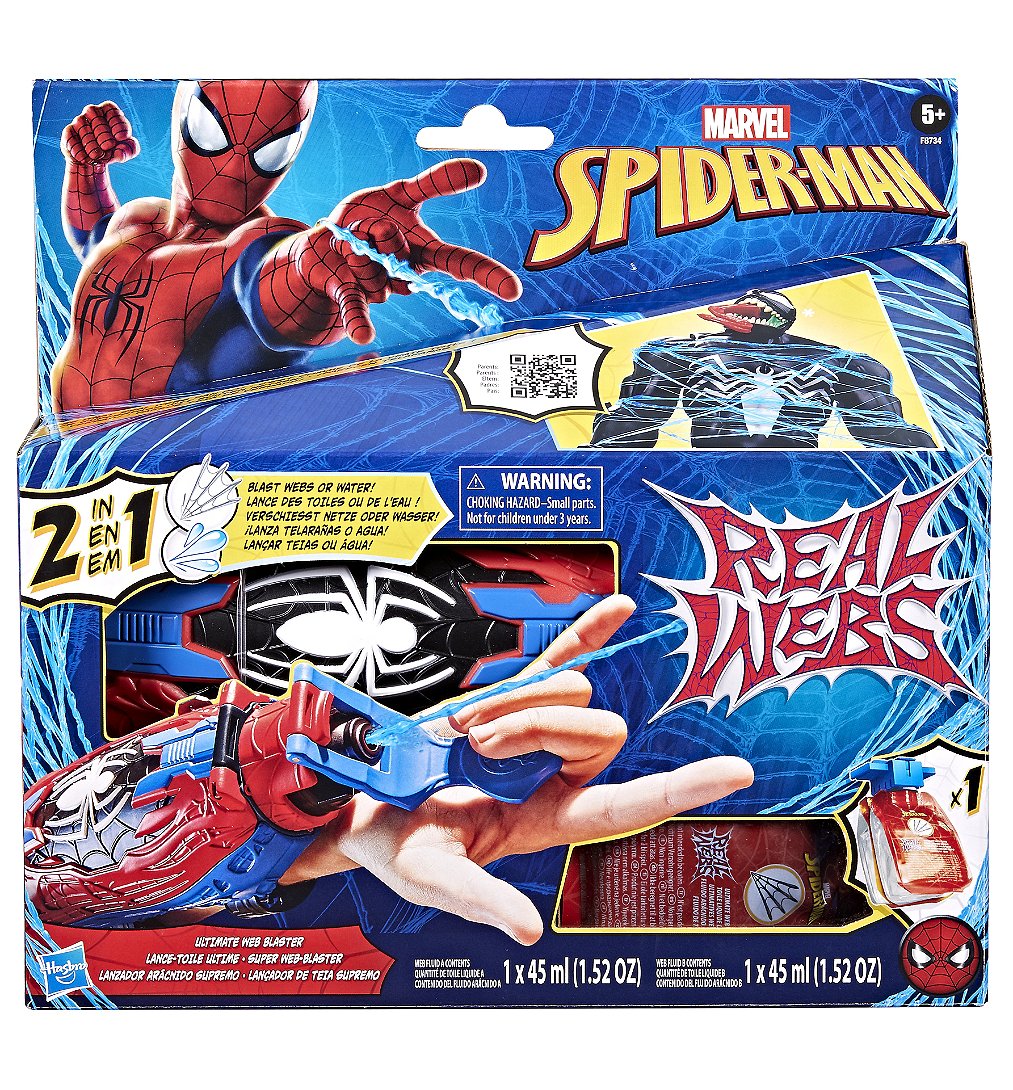 Prêt à lancer des toiles réalistes, comme Spider-Man ? Ce lance-toile Spider-Man utilise une toile liquide innovante qui se transforme en filaments gélatineux avec lesquels les enfants peuvent jouer ! Ce blaster utilise la plus récente technologie de toile et permet de jouer de 3 manières. Les enfants à partir de 5 ans peuvent fixer le blaster sur leur poignet et imiter le geste de Spider-Man qui lance des toiles en appuyant sur le bouton pour lancer des toiles ou de l'eau ! Les enfants peuvent jouer avec la toile et imaginer capturer des vilains comme Spider-Man en enveloppant des figurines ou d'autres jouets Spider-Man (vendus séparément) avec de la toile ! Le blaster inclut 1 sachet Real Webs (recharges disponibles, vendues séparément) et 1 sachet à eau réutilisable. Le Lance-toile ultime est un super cadeau pour filles et garçons et il peut être un accessoire amusant pour un déguisement de Spider-Man ou pour le combiner avec un masque de Spider-Man ! Copyright MARVEL. Toutes les marques de commerce et les marques de commerce déposées appartiennent à leurs propriétaires respectifs. Hasbro et tous les termes associés sont des marques de commerce de Hasbro.