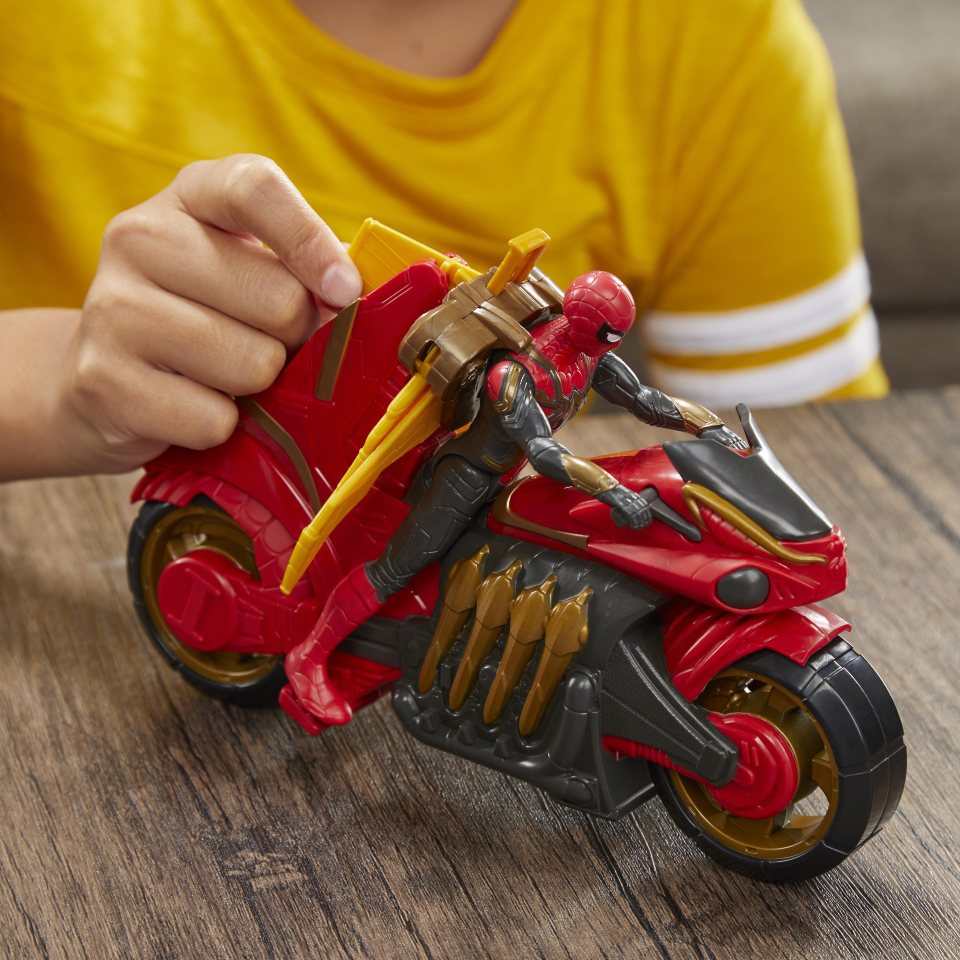 | Plus produit | MOTO ET FIGURINE AMOVIBLE DE 15 CM INSPIRÉES DU FILM : Cette figurine Spider-Man de 15 cm et sa Super arachno-moto sont inspirées du film Spider-Man de l\'univers cinématographique Marvel ON PLACE SPIDER-MAN SUR SA MOTO, PUIS ON ROULE À LA RESCOUSSE : On imagine se joindre à Spider-Man, le héros emblématique de Marvel, tandis qu\'il s\'élance à travers la ville sur une moto deluxe au design emblématique inspiré de Spider-Man INCLUT UN ACCESSOIRE DORSAL AMOVIBLE AVEC AILES DE PLANEUR DÉPLOYABLES : Quand on enlève Spider-Man de la Super arachno-moto, ses ailes se déploient ! Ses ailes se referment quand on assoit la figurine sur sa moto rouge. Il est prêt à conduire LA FIGURINE ARTICULÉE PORTE UN COSTUME COMBINÉ : La figurine a 4 points d\'articulation (ses bras et ses jambes bougent) et elle porte un costume combiné inspiré du film IL Y A AUSSI D\'AUTRES FIGURINES ET ÉQUIPEMENTS DE SUPER-HÉROS SPIDER-MAN : Il y a aussi d\'autres jouets Spider-Man inspirés du film Spider-Man de Marvel. Autres produits vendus séparément. Dans la limite des stocks |
