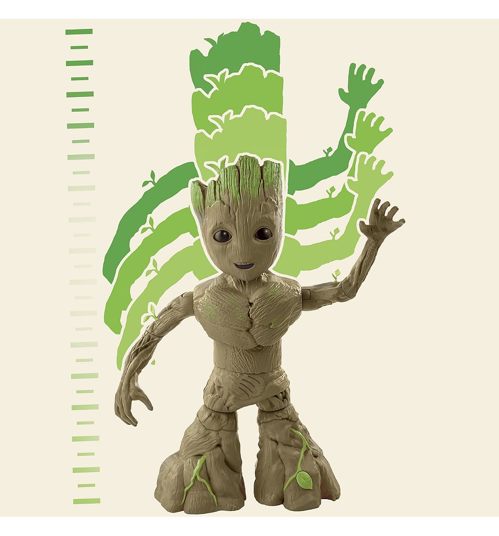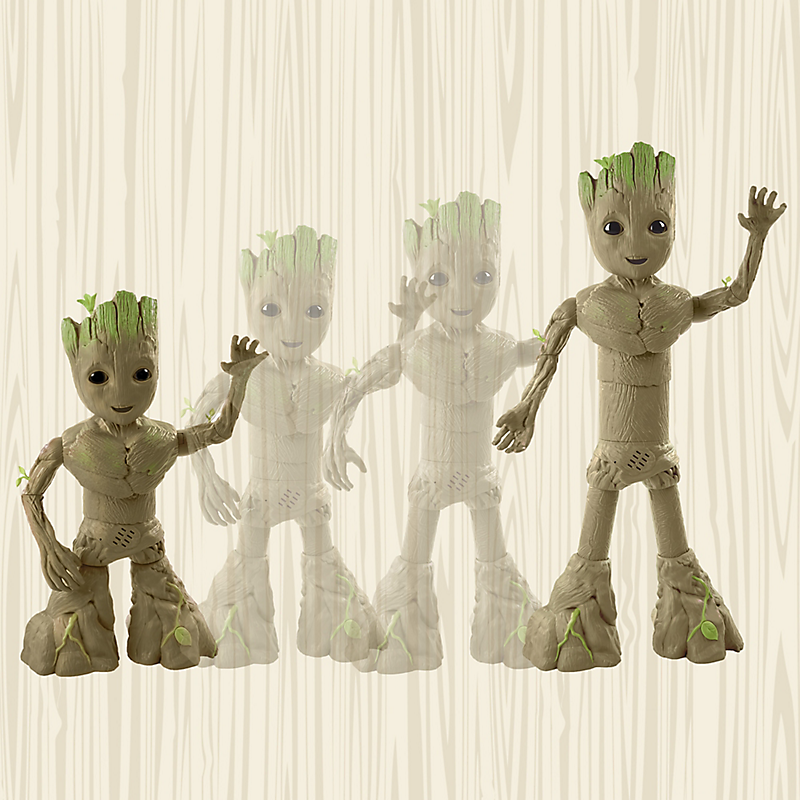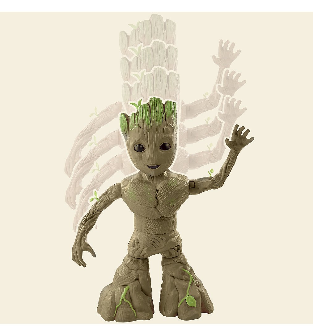 Un Groot animé et interactif qui grandit et qui danse. Il détecte la musique et réagit à la voix et se met à grandir et à danser. Il parle et produit des sons hilarants et joue de la musique. Bras et tête articulés. Grandit de 34 à 46 cm