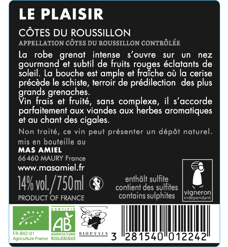 | Libellé | Mas Amiel Le Plaisir BIO, 2023 - Côtes-du-Roussillon AOP - Rouge - 75 cl |