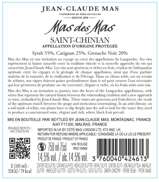 | Libellé | Mas des Mas, Jean Claude Mas, 2024 - Saint-Chinian AOP - Rouge - 75 cl |