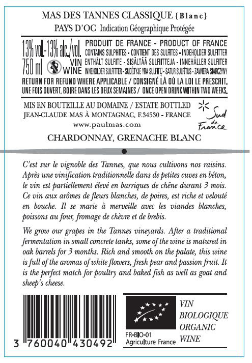| Libellé | Mas des Tannes BIO, 2022 - Pays d'Oc IGP - Blanc Demi-sec - 75 cl |