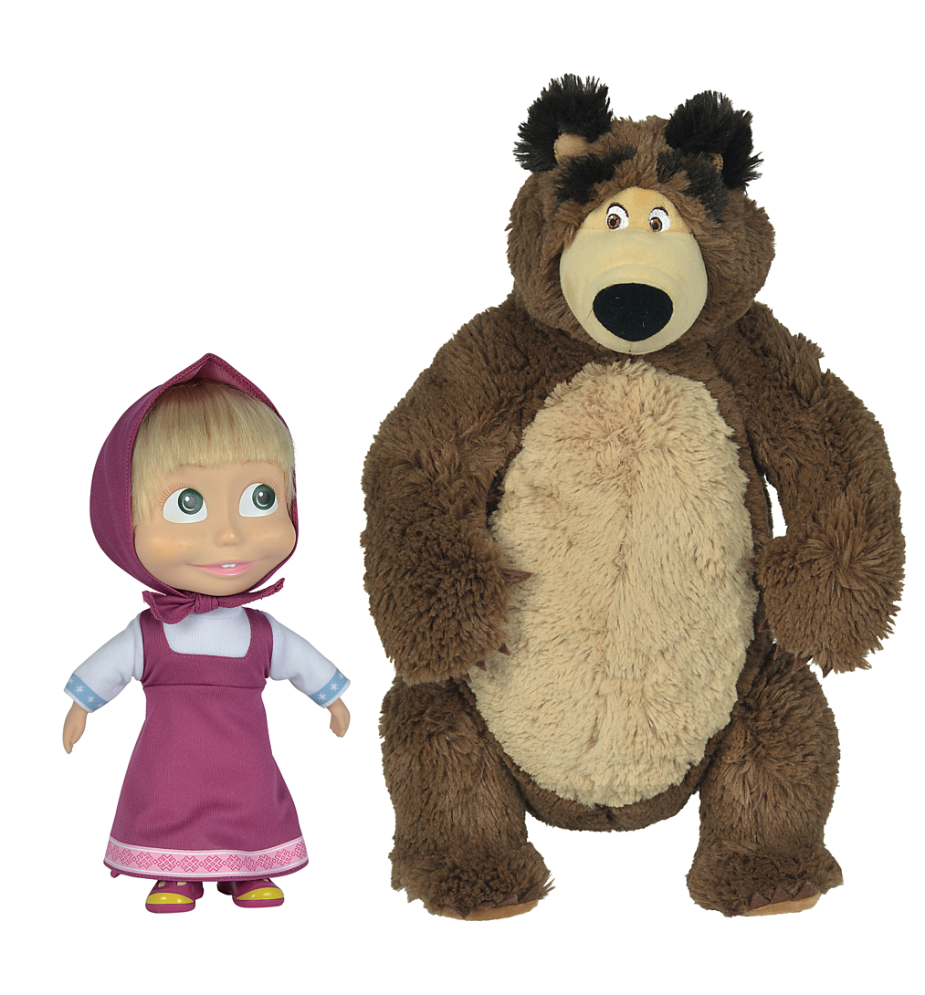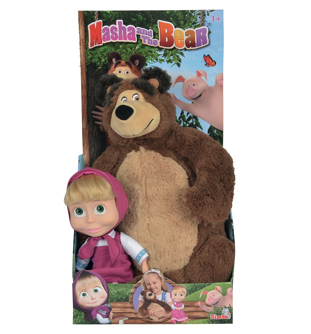 Un set qui réunit les 2 amis du dessin animé Masha et Michka : - 1 grande peluche Michka 43cm pouvant se tenir assis et qui possède des pattes mobiles - 1 poupée Masha 23cm, corps mou et tête en vinyle