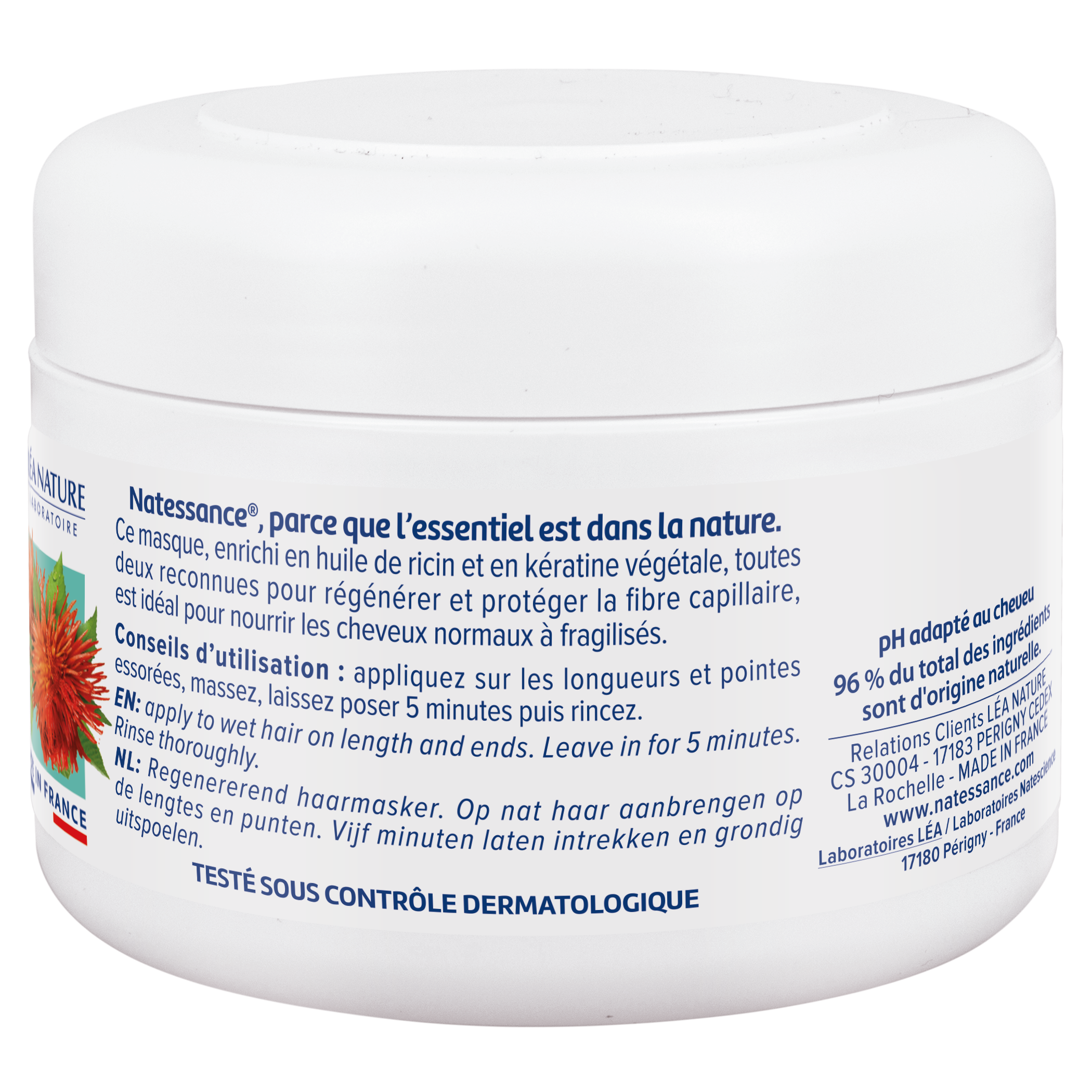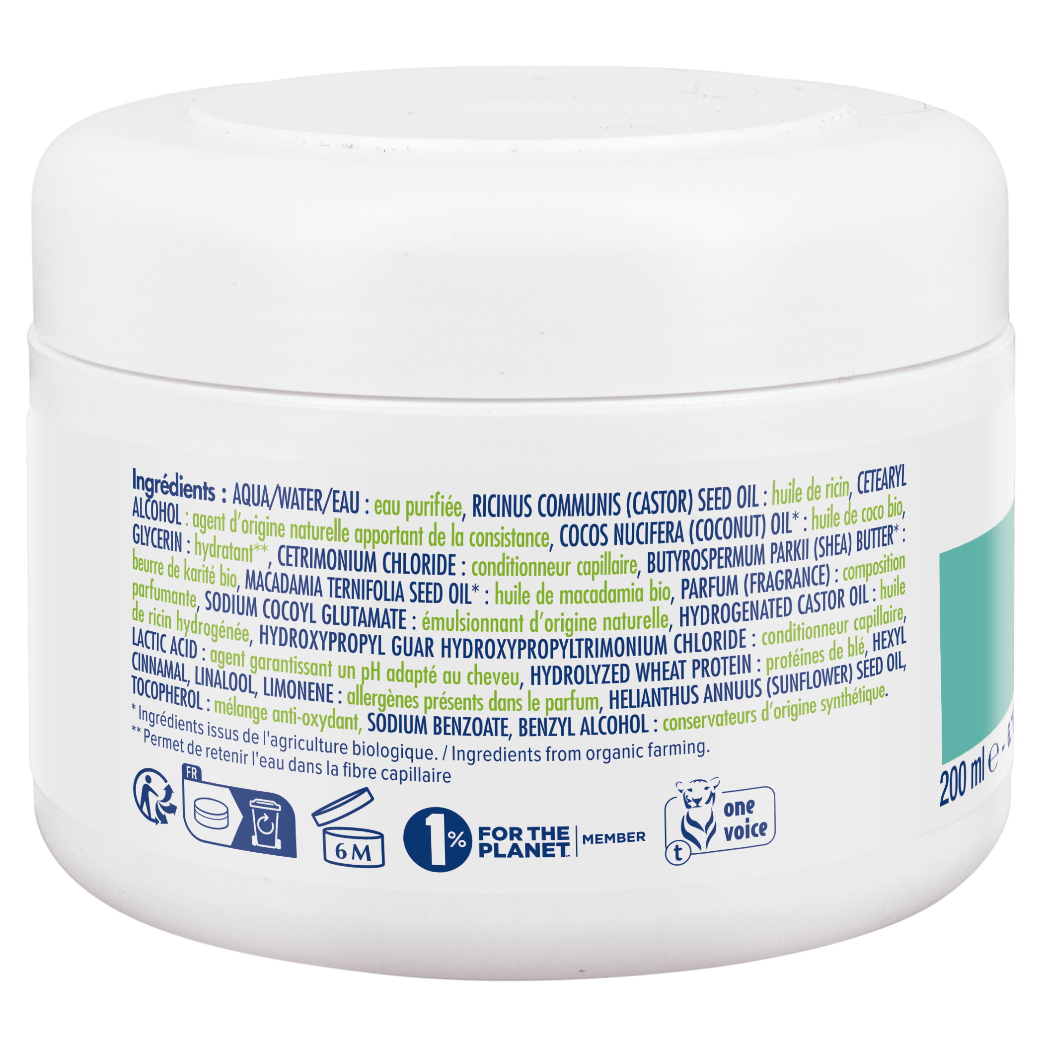 Enrichi en huiles de ricin, de macadamia, de coco et en kératine végétale, ce masque capillaire répare, nourrit, renforce, et protège les cheveux. Votre chevelure est sublimée, brillante et éclatante de santé dès la première utilisation. TESTÉ SOUS CONTRÔLE DERMATOLOGIQUE