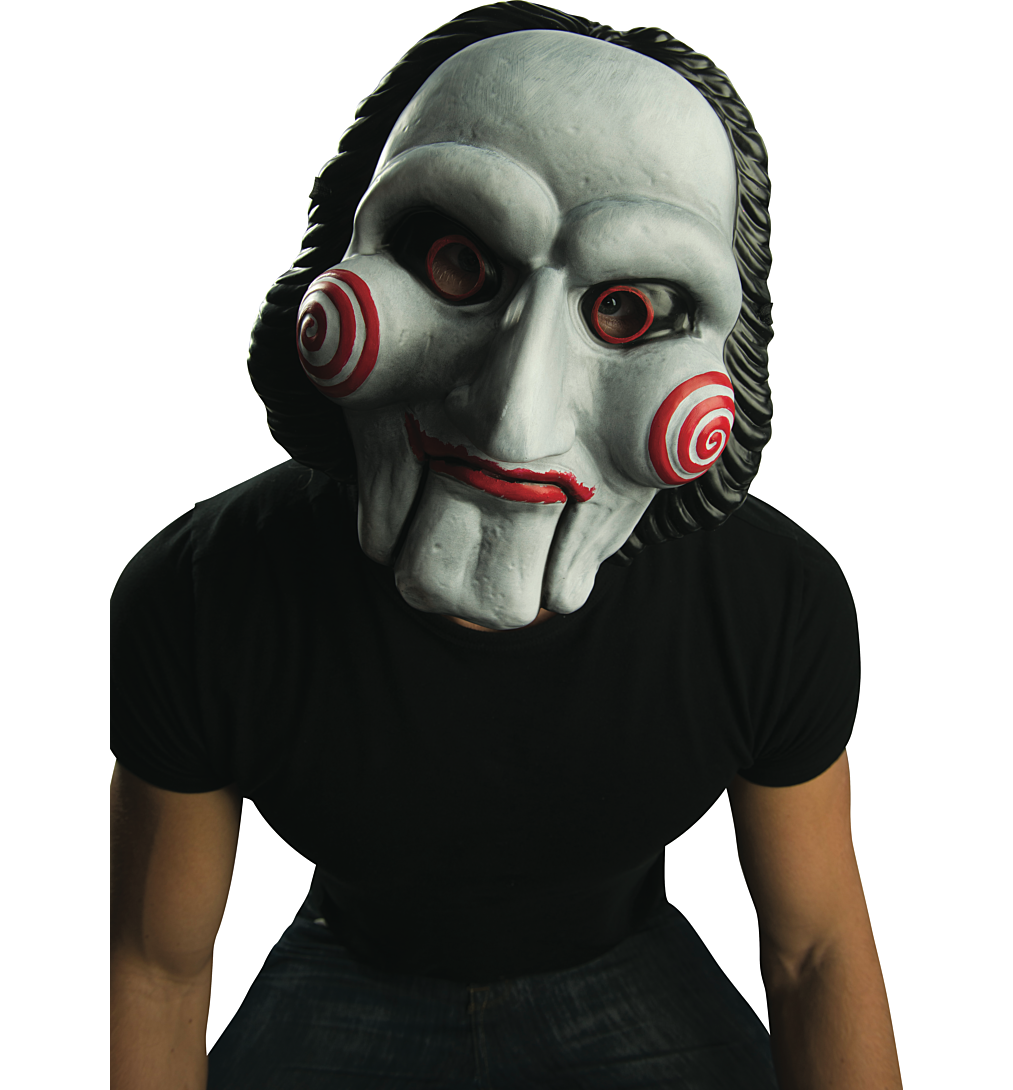 Un masque Saw en PVC avec attaches élastiques à l’arrière.