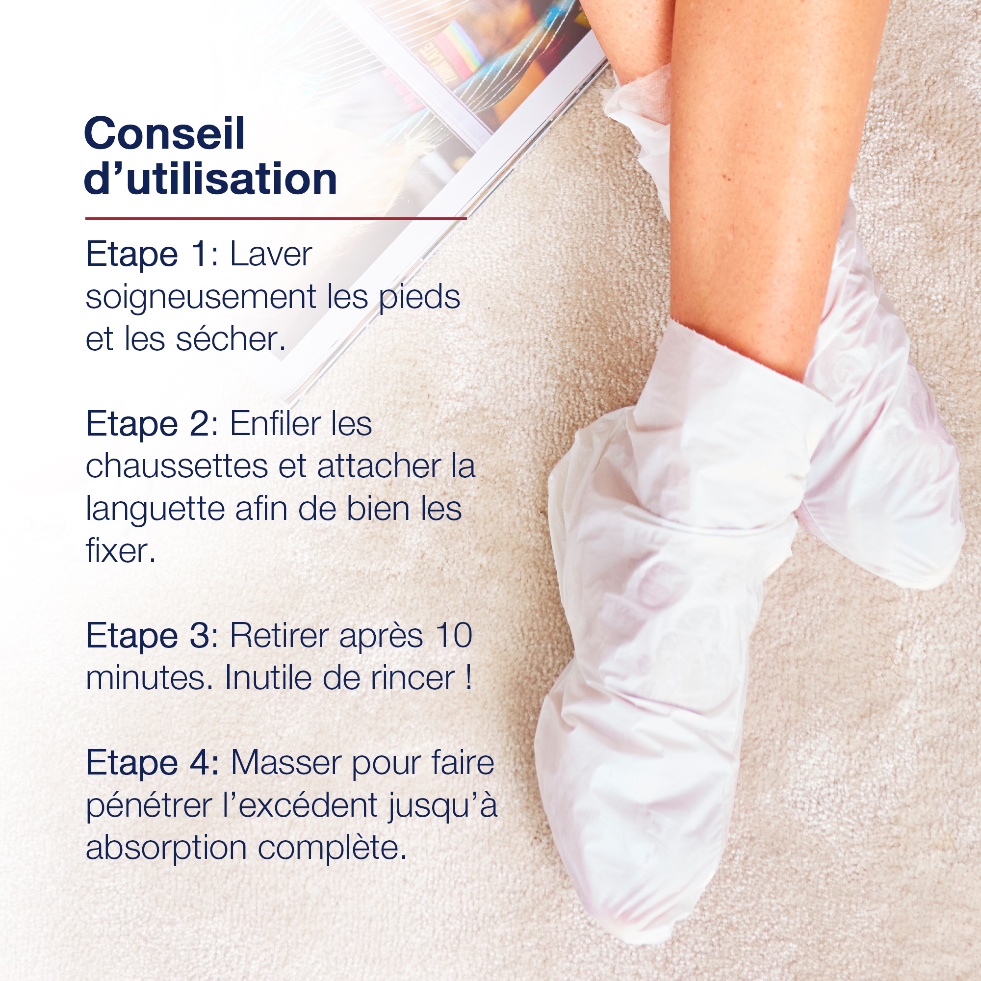 Etape 1 : Laver soigneusement les pieds et les sécher. Etape 2 : Enfiler les chaussettes et attacher la languette afin de bien les fixer. Etape 3 : Retirer après 10 minutes. Inutile de rincer ! Etape 4 : Masser pour faire pénétrer l’excédent jusqu’à absorption complète.