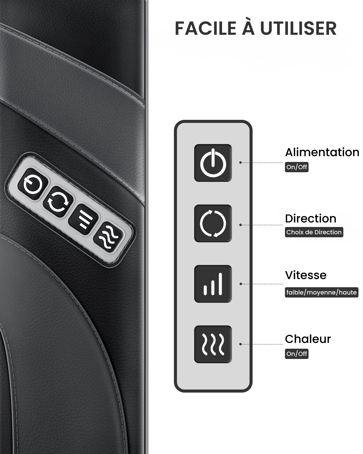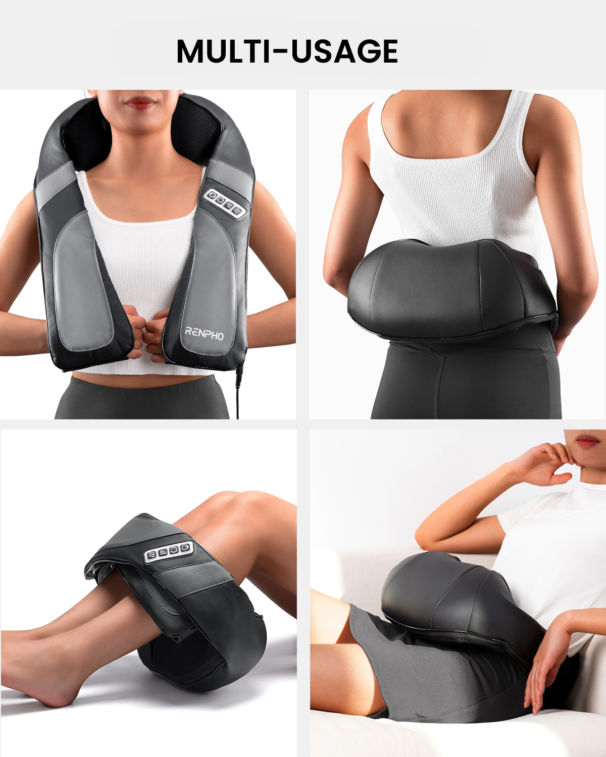 Votre masseur personnel, Pour atténuer les douleurs au cou, à l’épaule, au dos, ou aux jambes, ainsi que pour détendre les muscles et réduire le stress. Relaxez-vous de manière optimale avec le masseur de cou, d'épaules, de dos et de jambes RENPHO. Bénéficiez d'un massage Shiatsu profond à 8 nœuds, avec la possibilité de sélectionner parmi 3 niveaux d'intensité et 2 directions. La fonction de chaleur, apaisante, et le tissu doux utilisé dans la conception, garantissent un confort accru. Idéal pour la maison, le bureau ou en déplacement – comprend un sac de transport et 2 adaptateurs. L’appareil emploie la technique de massage Shiatsu traditionnelle japonaise pour atténuer les tensions au niveau du cou et des épaules. Il est équipé de têtes ou de nœuds de massage rotatifs qui offrent un massage en profondeur et intègre une thérapie thermique pour relaxer les muscles. Cet appareil pratique peut être utilisé à domicile, au bureau ou en déplacement pour diminuer le stress et améliorer le bien-être.