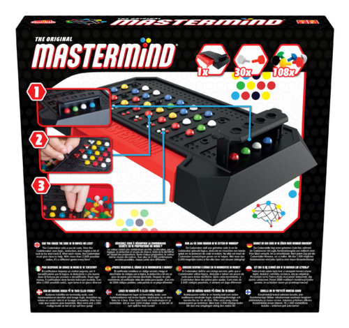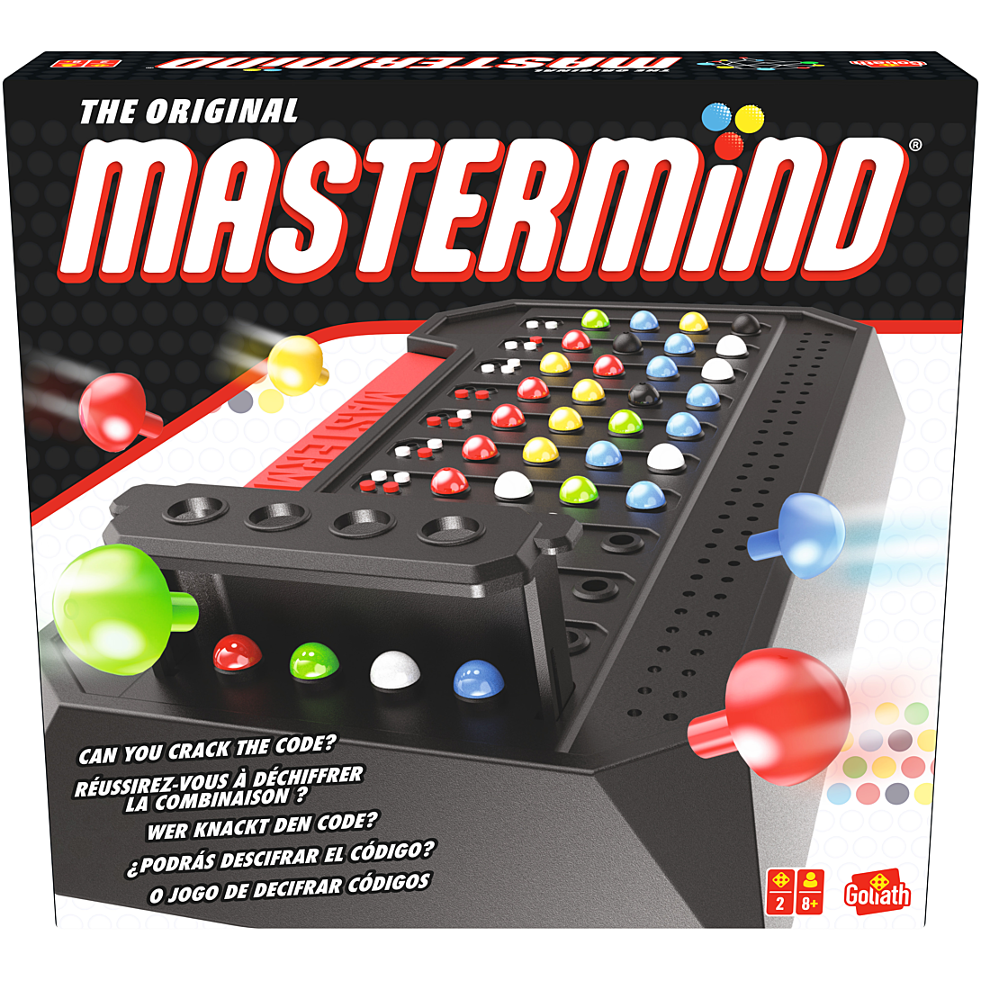 Un grand classique des jeux de déduction, de logique et de réflexion. Jouez tour à tour le rôle de codeur ou de décodeur. Trouvez la combinaison secrète de votre adversaire en moins de propositions qu’il ne lui en faudra pour deviner la vôtre. Un jeu pour 2 joueurs à partir de 8 ans. Contenu : Plateau de jeu avec compartiment de rangement intégré et cache-pions, 108 pions Code de 6 couleurs, 30 pions Clé rouges et blancs.