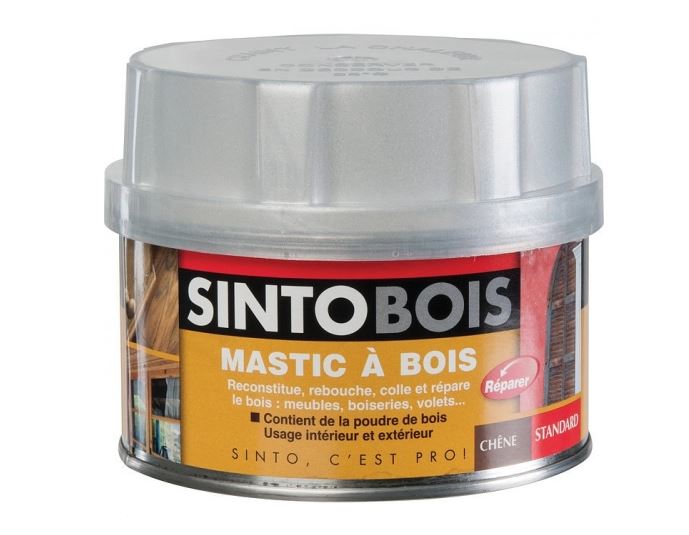 Mastic bi-composants souple pour réparer, restaurer, reconstituer une partie de bois manquante, boucher, coller le bois et ses dérivés. Grande facilité d’application. Bonne résistance mécanique. Excellente adhérence sur bois. Applicable en intérieur et extérieur. Excellent garnissant (possibilité de coffrage pour reconstituer un défaut important). Prise rapide. Application : Mélanger 100g de mastic avec 4g de durcisseur (soit environ une cuillère à soupe pour un grain de café). Si vous souhaitez une teinte sur mesure, mélanger au préalable différentes teintes de mastic sintobois entre elles ou colorer le avec des colorants en poudre ou des colorants universels pour peintures (à base organique). Pour obtenir une teinte avant polymérisation, utiliser de préférence SINTOBOIS CHENE. Pour teinter SINTOBOIS après polymérisation, utiliser de préférence SINTOBOIS SAPIN. Appliquer à l’aide d’une spatule ou d’une cale métallique.Mélanger 100g de mastic avec 4g de durcisseur (soit environ une cuillère à soupe pour un grain de café). Caractéristiques : Aspect : Pâteux Teintes : Chêne-Chêne moyen-Chêne clair-Movingui Merisier-Acajou-Sapin-Blanc-Teck Type de liant : Polyester Durcisseur Péroxyde de dibenzoyle Densité : 1,2 Point éclair : 31°C Temps de travail : 6 minutes à 20°C pour 4% de durcisseur Temps de séchage : 20 à 10 minutes à 20°C pour 4% de durcisseur Ponçable et recouvrable : 20 à 25 minutes à 20°C pour 4% de durcisseur Grain P80 sec Température d’application : 10 à 30°C Conservation : 12 mois dans son emballage d'origine bien fermé dans un endroit frais (< 25 °C), à l