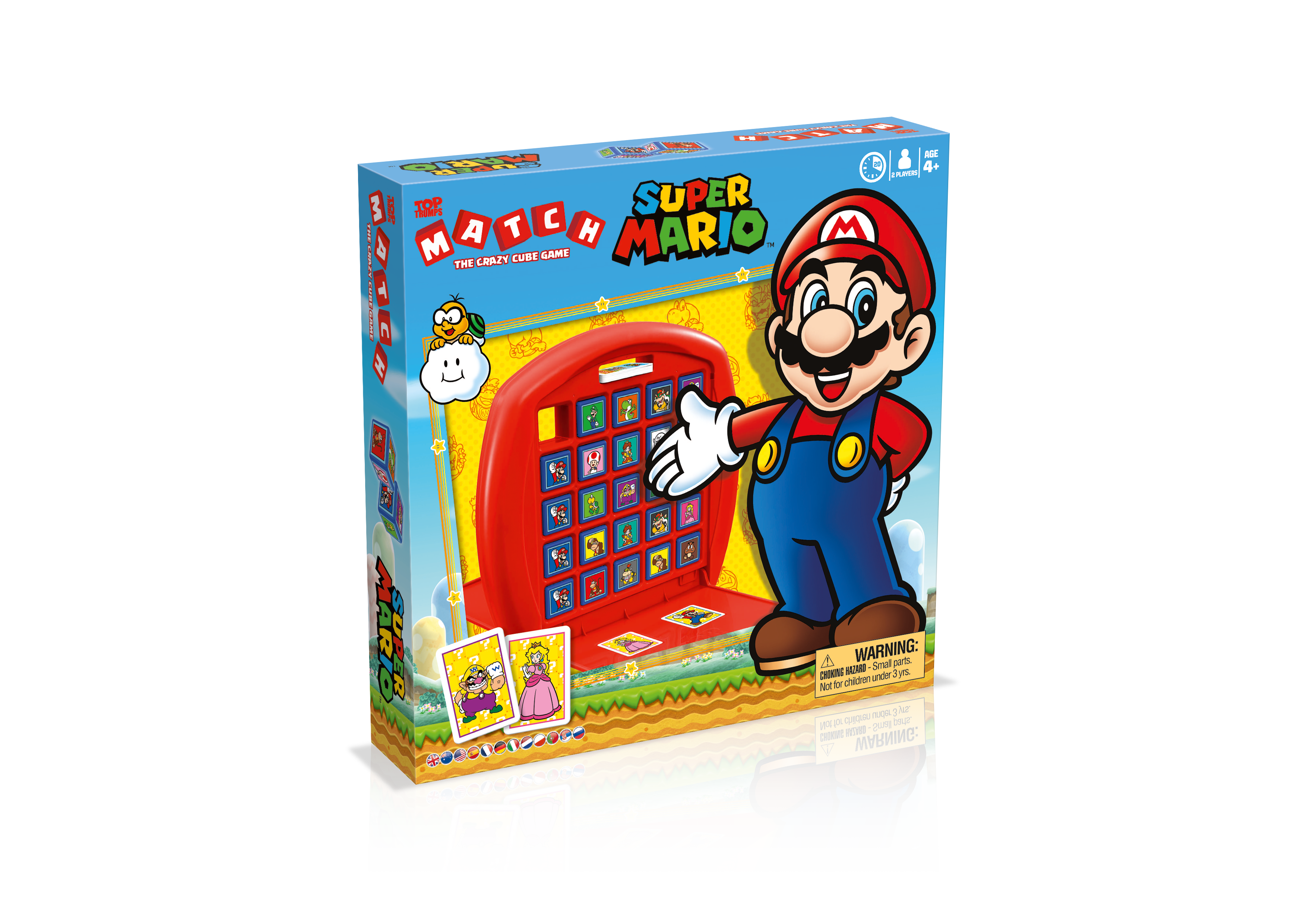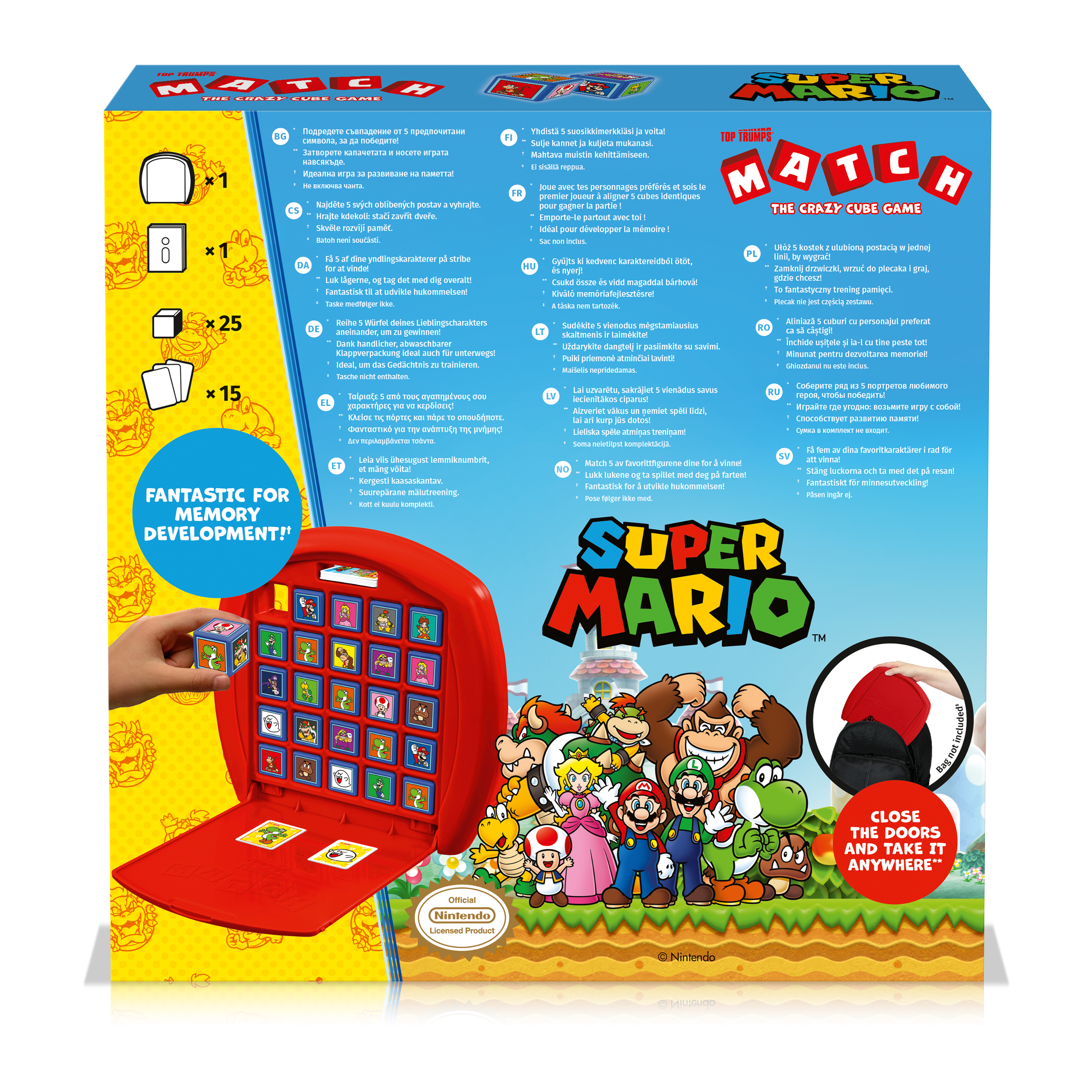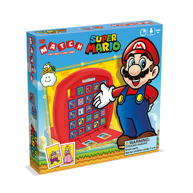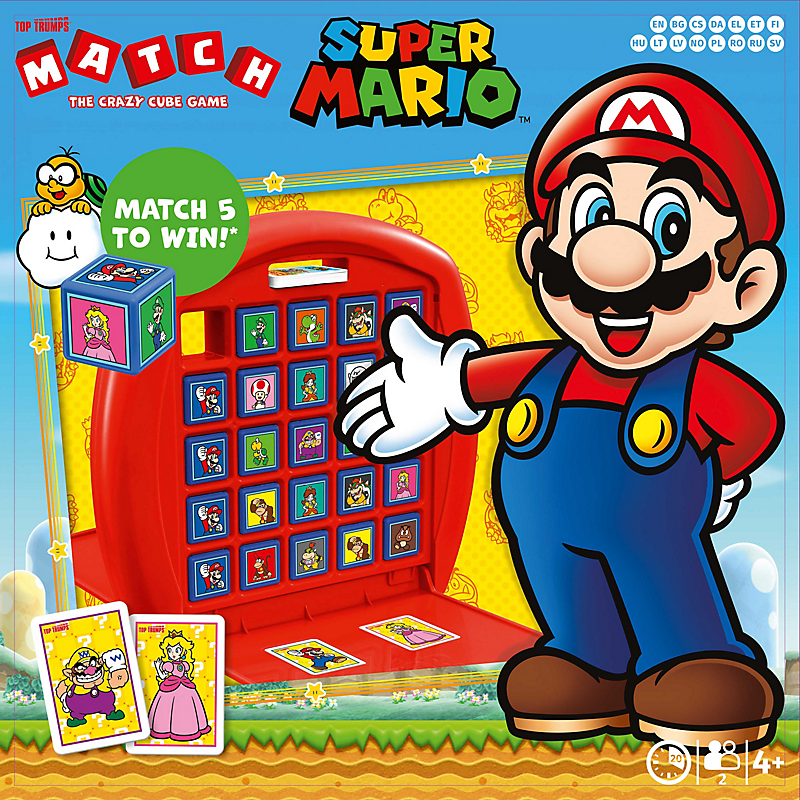 Aligne 5 cubes aux couleurs des héros de Super Mario et sois le premier à crier MATCH pour remporter la victoire !! Avec 15 personnages issus du monde de Nintendo, le Match Super Mario est un jeu tactique pour deux qui te permettra de jouer avec tes héros préférés ! Contenu : 1 console, 25 cubes, 15 cartes personnages Super Mario + les règles du jeu. Durée de la partie : 10 à 20 minutes environ. A partir de 4 ans – 2 joueurs. Facile à ranger, la console de jeu est idéale pour transporter ton Match partout !