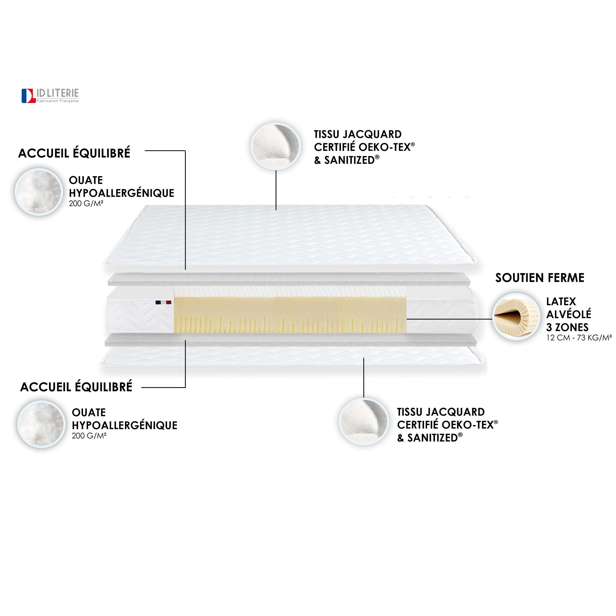 Ame : 12 cm de Latex densité 73 kg/m3 3 zones