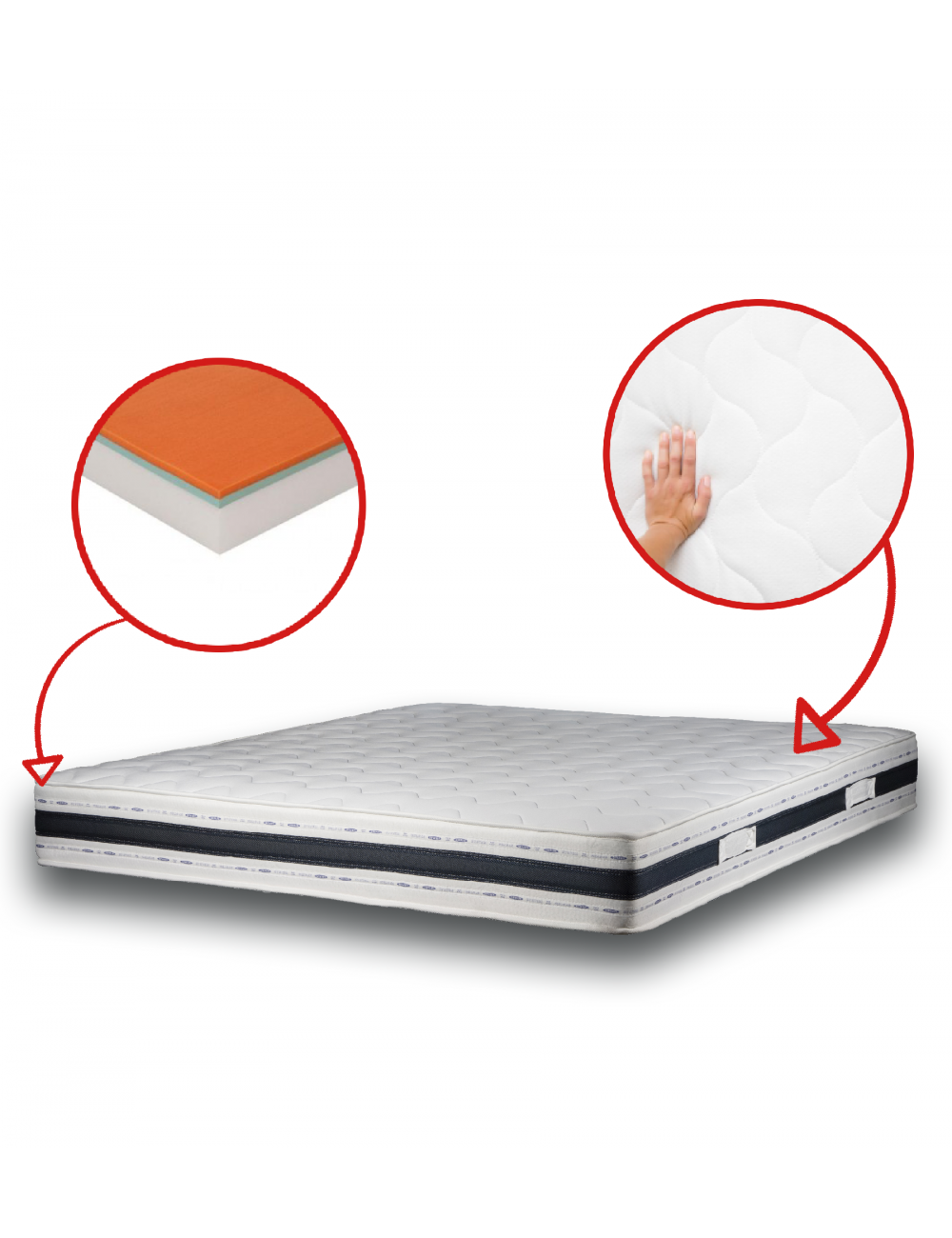 Le Confoplus est un matelas realisé avec multicouche:mousse ergonomique 25D + mousse mémoire de forme 50D.