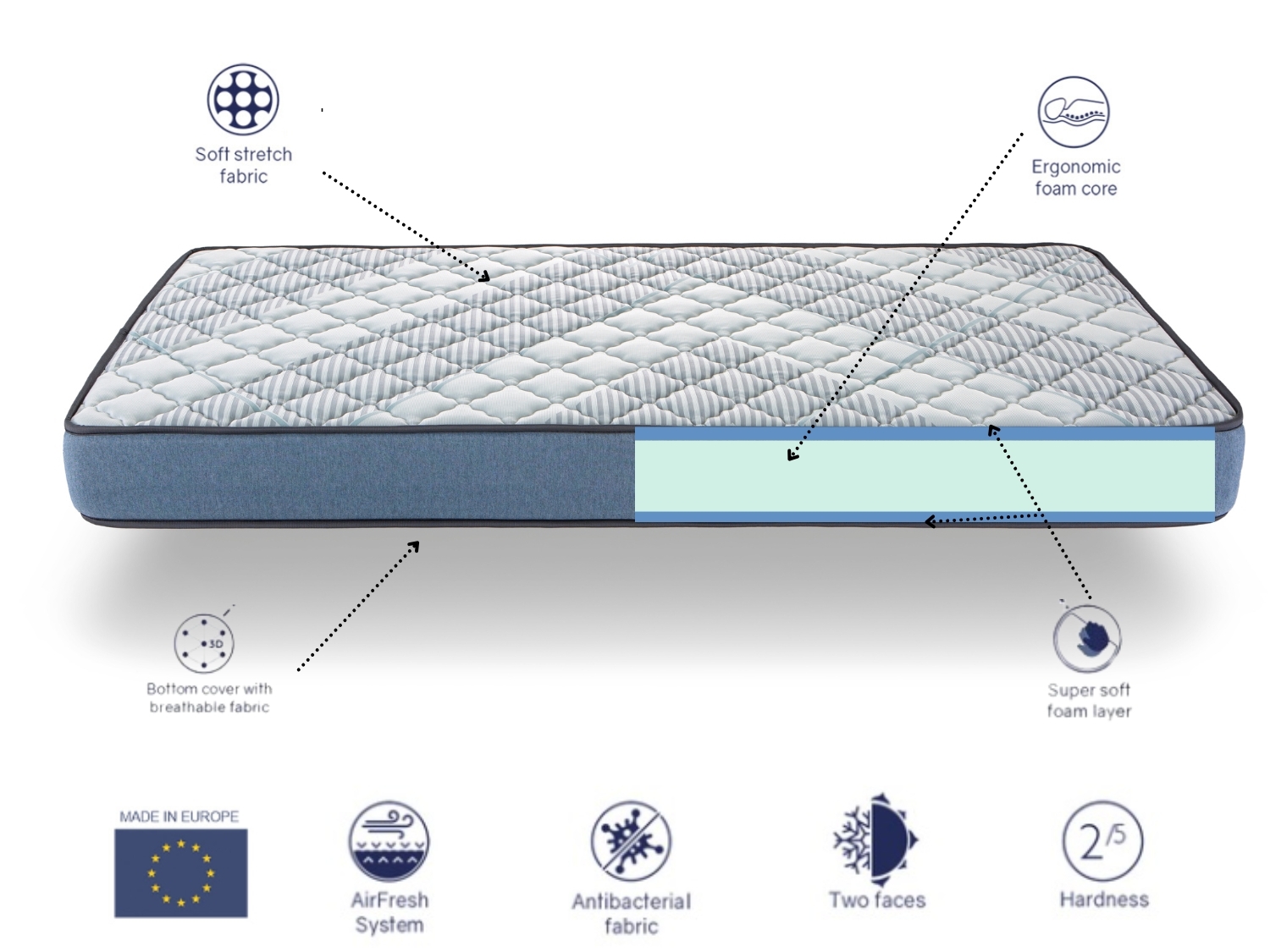 Matelas ergonomique et respirant, idéal pour les lits d'enfants et les personnes qui recherchent un confort optimal au coucher. Son noyau en mousse HR de fermeté moyenne répartit bien les points de pression pour un confort accru. La face supérieure offre douceur et fraîcheur grâce au rembourrage en fibre et en mousse ultra-douce, tandis que la face inférieure, en tissu 3D, améliore la ventilation et dissipe la chaleur pendant la nuit.