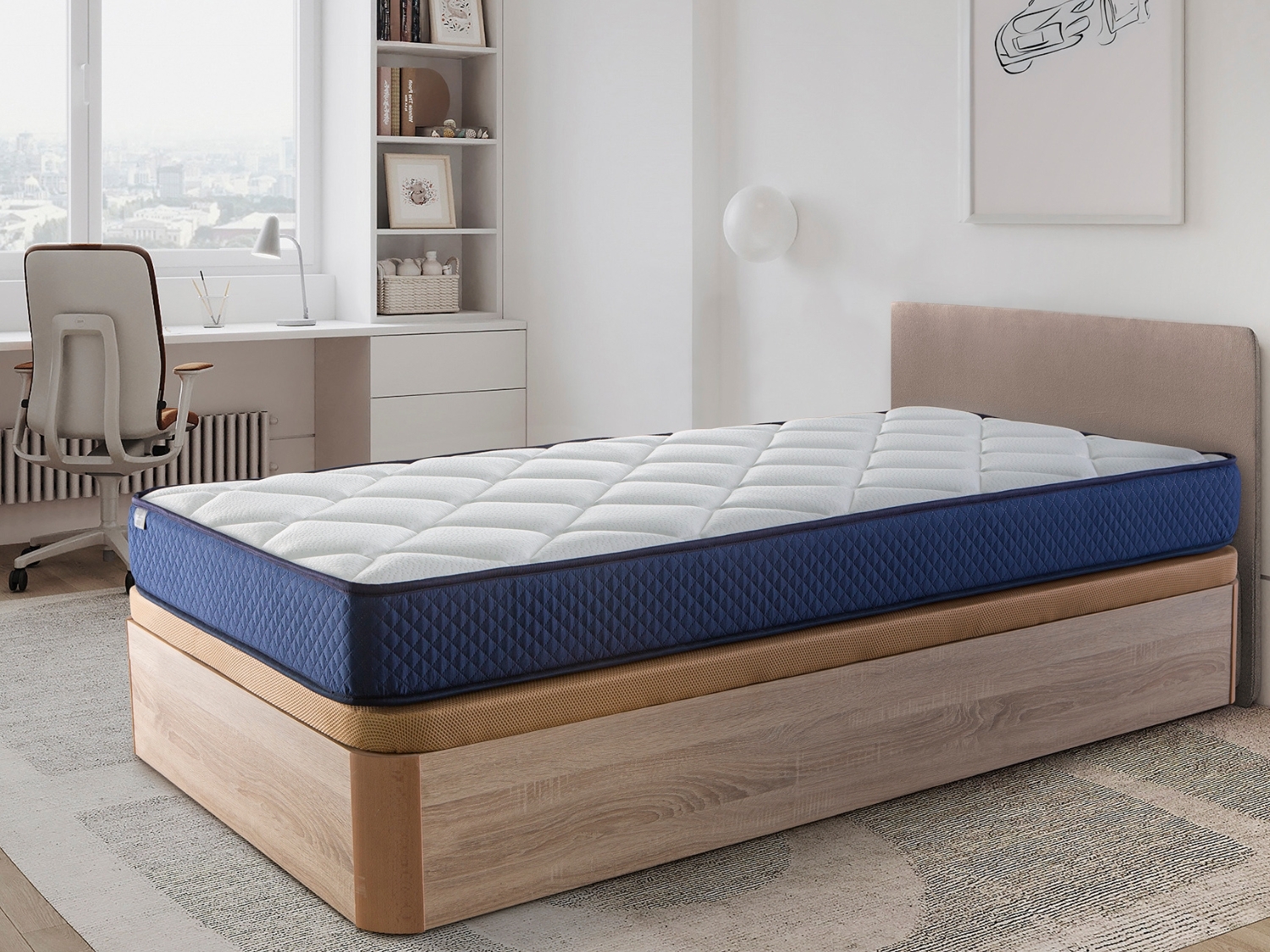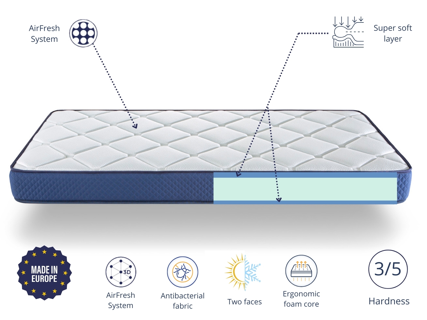 Matelas ergonomique et respirant, idéal pour les lits d'enfants et les personnes qui recherchent le confort au moment de se coucher. Son noyau en mousse HR s'adapte au corps et améliore la ventilation grâce à sa structure poreuse. La face supérieure, rembourrée de fibres et de mousse ultra-douce, offre un confort maximal, tandis que la face inférieure, en tissu 3D, favorise la dissipation de la chaleur pendant la nuit.