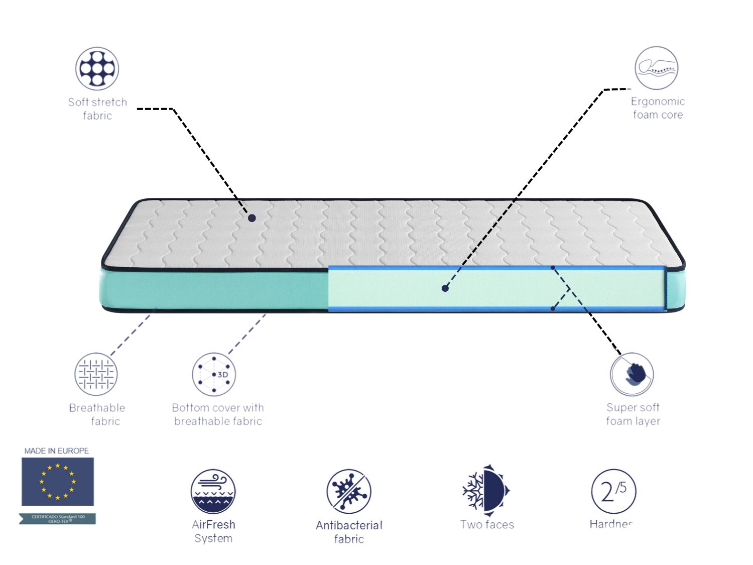 Matelas léger, frais et confortable, au design jeune et minimaliste. Idéal pour les lits d'enfants, les canapés-lits et les canapés convertibles. Son noyau en mousse souple offre une répartition optimale des points de pression pour un confort accru. Il est réversible, avec une face été en tissu élastique matelassé et une face hiver avec système Airfresh et tissu 3D qui améliore la ventilation. Finition jeune, traitement anti-punaises et expédition enroulé dans une boîte pour faciliter le transport.