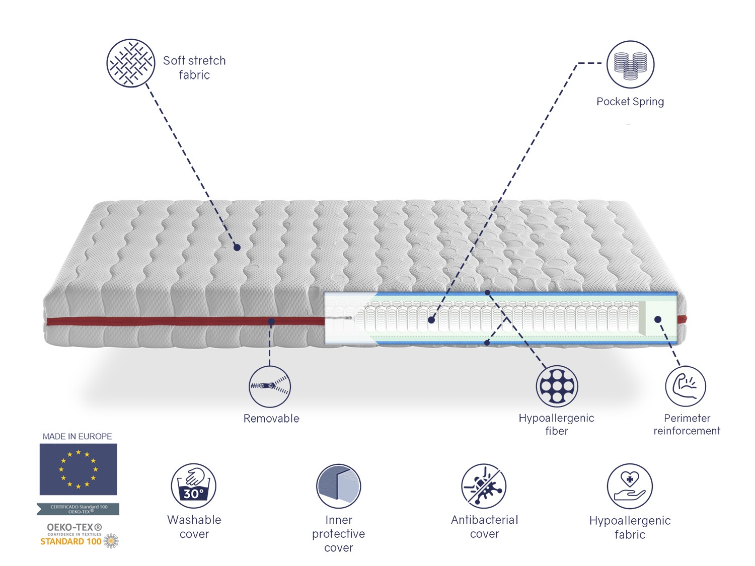 Ce matelas à ressorts ensachés pour enfant est conçu pour accompagner la croissance de l'enfant. Il offre une ergonomie optimale et une fermeté adaptée au bon alignement du dos. Son noyau à ressorts ensachés indépendants, doté d'un cadre périmétrique extra-ferme, garantit sécurité, durabilité et adaptation précise au corps, tandis que les couches de mousse haute densité améliorent la posture du dos, de la nuque et des épaules. Déhoussable et lavable, il est doté d'une double housse : une housse extérieure en tissu extensible rembourré de fibres douces, élastiques et anti-acariens, et une housse intérieure multi-élastique qui protège le noyau et facilite son retrait grâce à une fermeture éclair en L. Fabriqué selon des normes de qualité strictes, avec un impact environnemental minimal et sans substances nocives. Avec ses 18 cm de hauteur, il est idéal pour les lits gigognes, les lits Montessori et tous types de lits pour enfants. Son design jeune et moderne est pensé pour le bien-être des plus petits.