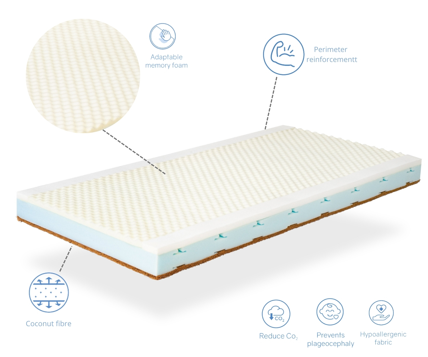 Noyau : Combine 2 couches, la couche supérieure est en viscoélastique profilée, c'est-à-dire que la mousse est en forme de vagues, pour faciliter la circulation de l'oxygène, rendant le bébé plus confortable et aidant à réduire la plagiocéphalie. La couche inférieure est constituée de mousse de dernière génération, gardant une fermeté moyenne.