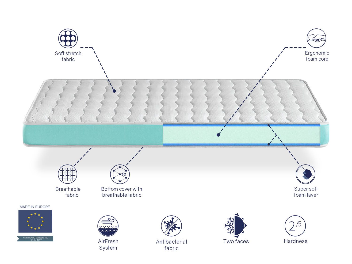 Pendant les premiers stades de la croissance de nos petits, le repos est un élément très important de leur santé et de leur vitalité. Le matelas Ekocen a été spécialement conçu pour s'adapter aux besoins de notre bébé. Avec un rembourrage en fibres hypoallergéniques et un noyau perforé, il permet une ventilation parfaite pour assurer la sécurité de votre bébé et éviter la création de poches de CO2.