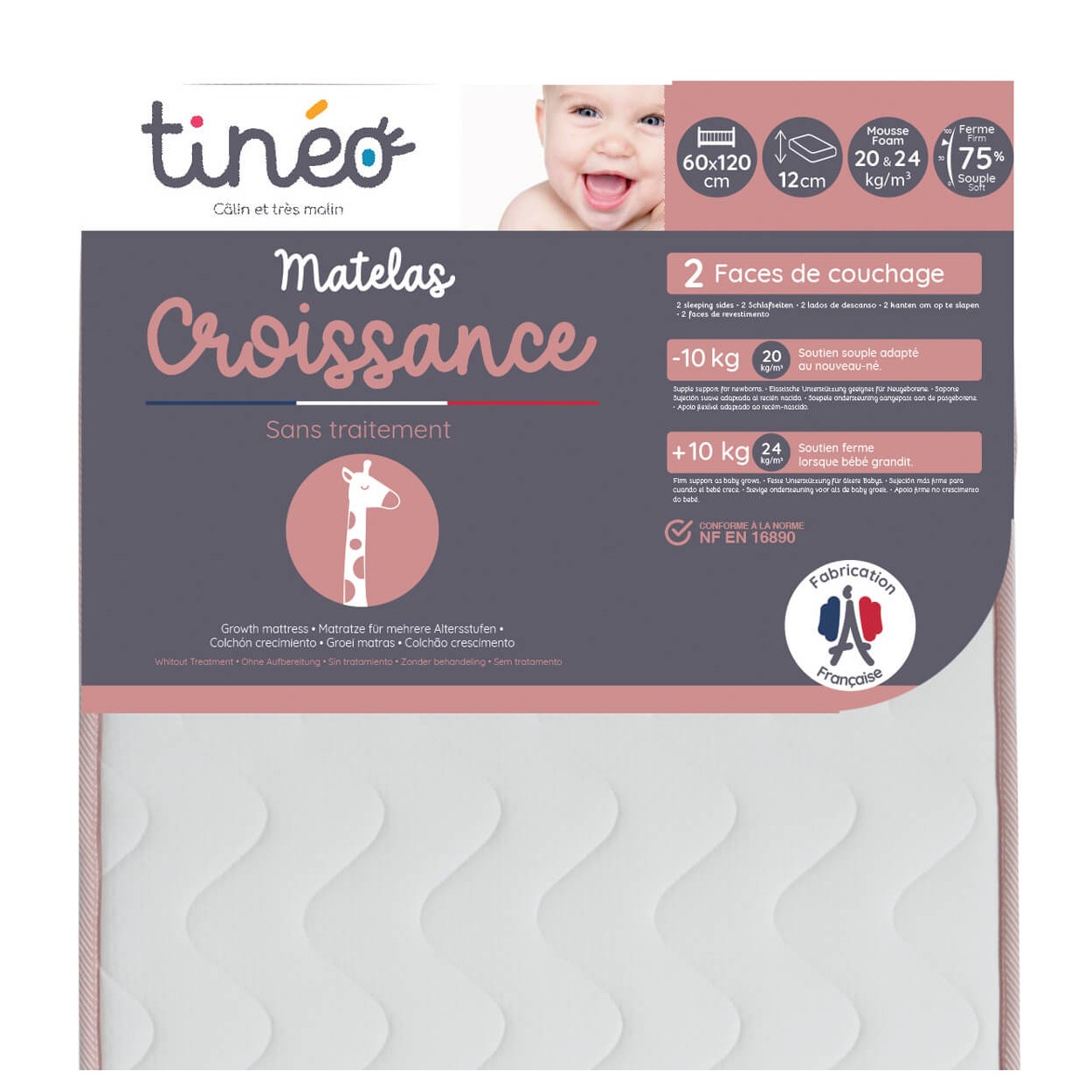Les avantages du matelas bébé Croissance Comme bébé passe beaucoup de temps à dormir les premières années et que son sommeil est essentiel à son développement, Tinéo porte une attention particulière à la mise au point de ses matelas.Le matelas bébé Croissance pour lit 60x120cm de Tinéo est un matelas évolutif qui garantit une nuit confortable à bébé durant les premières années de sa vie. Ce matelas Croissance bénéficie de l'action de 2 faces de soutien qui s'adaptent selon le poids de bébé.1 face de soutien souple adaptée à la morphologie de bébé jusqu'à 10 kg. La densité de la mousse est de 20kg/m3.1 face de soutien ferme adaptée à la morphologie de bébé au-delà de 10 kg. La densité de la mousse est de 24kg/m3.Pratique, le matelas Croissance de Tinéo est conçu avec des bandes cousues sur le coutil du matelas pour identifier facilement le côté adapté à bébé. L'une est adaptée jusqu'à ses 10kg et l'autre au-delà de 10kg.Un matelas 60x120 développé pour bébé et les parentsLe matelas bébé 60x120 Croissance possède une épaisseur de 12 cm pour garantir du confort à votre enfant durant son sommeil. L'âme de ce matelas bébé se compose d'une mousse polyuréthane. Cette matière de garnissage est l'une des plus répandues dans la conception et la fabrication de matelas pour bébé. L'avantage de cette mousse de matelas est l'adaptation parfaite au corps de bébé. Elle lui garantit fermeté et accueil enveloppant pour un sommeil de qualité. La mousse polyuréthane présente également l'avantage d'être un matériau léger.