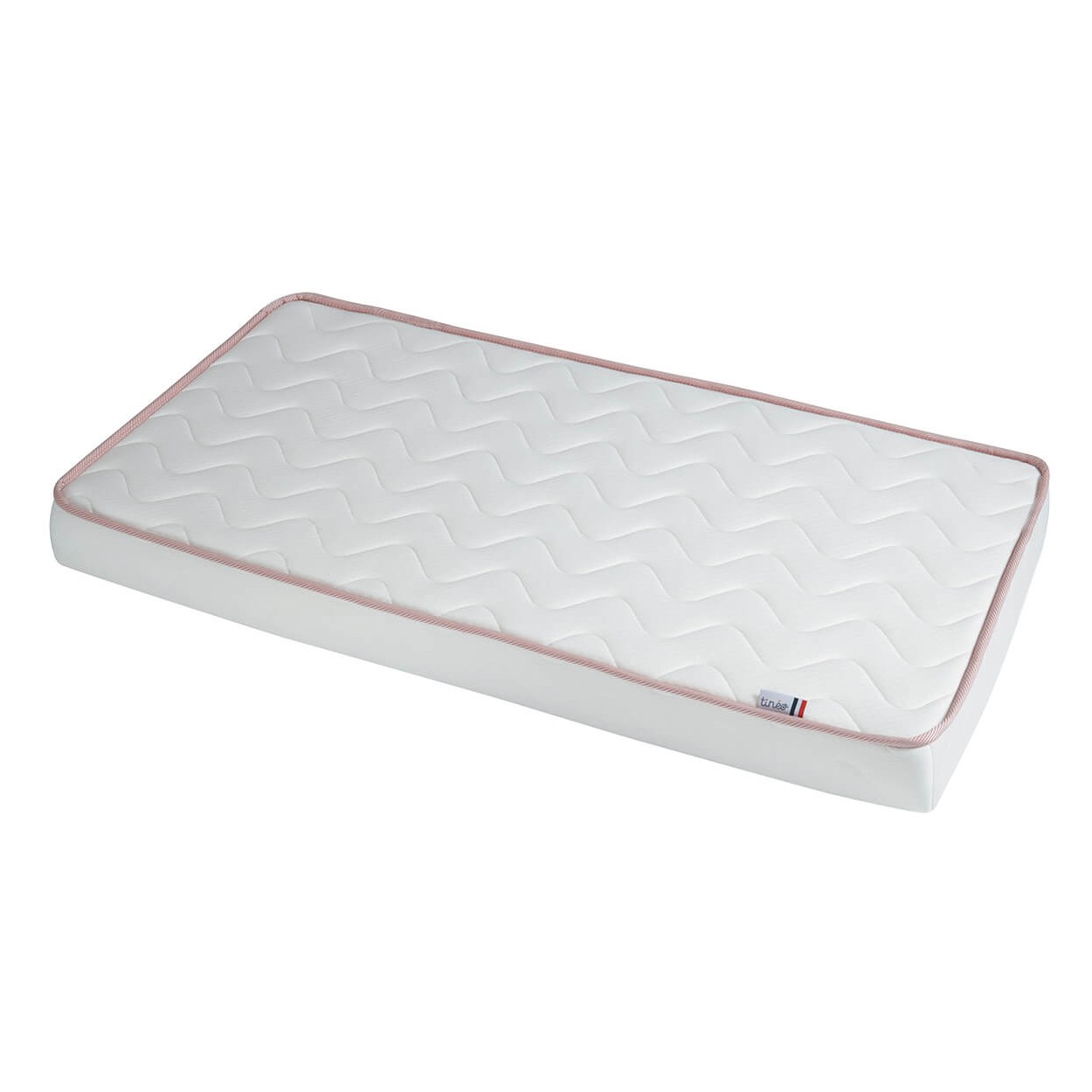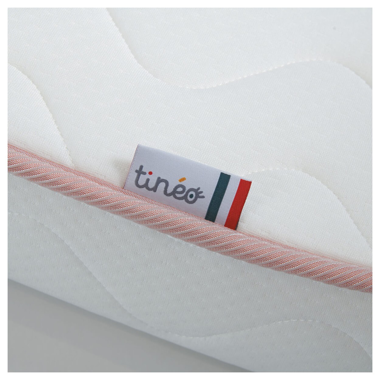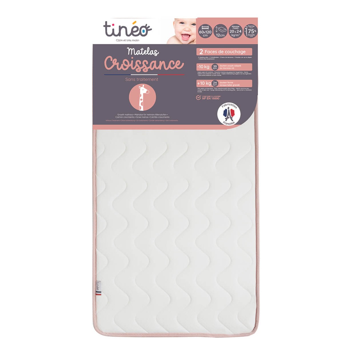 Les avantages du matelas bébé Croissance Comme bébé passe beaucoup de temps à dormir les premières années et que son sommeil est essentiel à son développement, Tinéo porte une attention particulière à la mise au point de ses matelas.Le matelas bébé Croissance pour lit 60x120cm de Tinéo est un matelas évolutif qui garantit une nuit confortable à bébé durant les premières années de sa vie. Ce matelas Croissance bénéficie de l'action de 2 faces de soutien qui s'adaptent selon le poids de bébé.1 face de soutien souple adaptée à la morphologie de bébé jusqu'à 10 kg. La densité de la mousse est de 20kg/m3.1 face de soutien ferme adaptée à la morphologie de bébé au-delà de 10 kg. La densité de la mousse est de 24kg/m3.Pratique, le matelas Croissance de Tinéo est conçu avec des bandes cousues sur le coutil du matelas pour identifier facilement le côté adapté à bébé. L'une est adaptée jusqu'à ses 10kg et l'autre au-delà de 10kg.Un matelas 60x120 développé pour bébé et les parentsLe matelas bébé 60x120 Croissance possède une épaisseur de 12 cm pour garantir du confort à votre enfant durant son sommeil. L'âme de ce matelas bébé se compose d'une mousse polyuréthane. Cette matière de garnissage est l'une des plus répandues dans la conception et la fabrication de matelas pour bébé. L'avantage de cette mousse de matelas est l'adaptation parfaite au corps de bébé. Elle lui garantit fermeté et accueil enveloppant pour un sommeil de qualité. La mousse polyuréthane présente également l'avantage d'être un matériau léger.