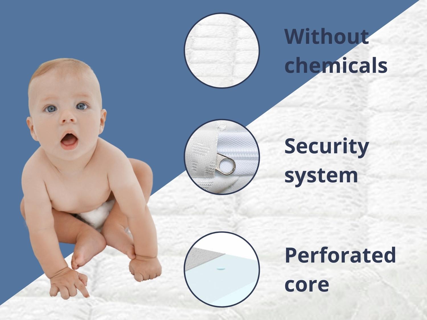 Mousse de dernière génération avec micro perforations qui garantissent une bonne ventilation, éliminant la chaleur et l'humidité. Sa densité est adéquate pour s'adapter au corps du bébé et éliminer les zones de pression, réduisant ainsi l'agitation nocturne. Prévient le risque de plagiocéphalie en offrant un repos plus sûr et plus sain.