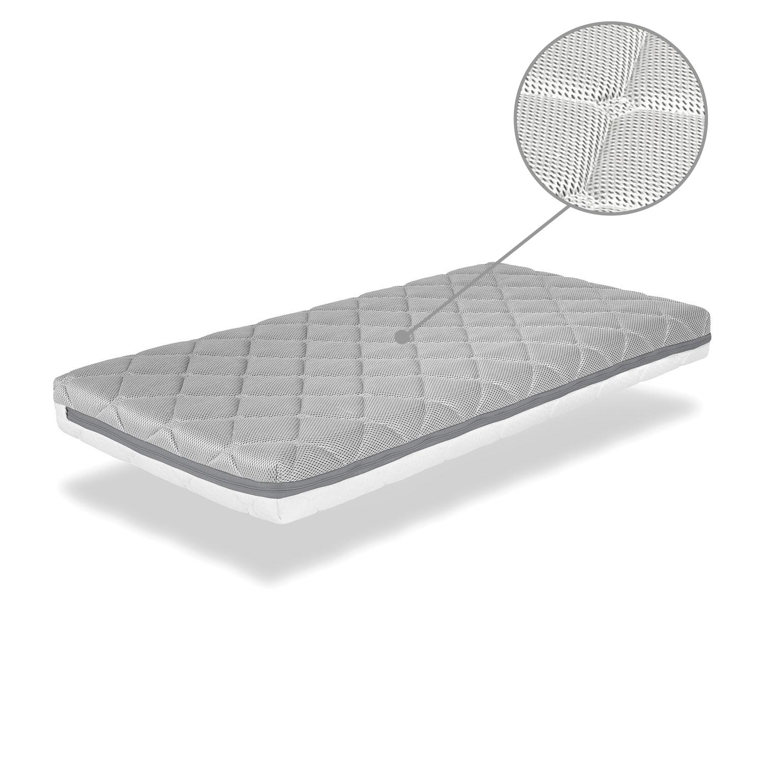 Mousse de dernière génération avec micro perforations qui garantissent une bonne ventilation, éliminant la chaleur et l'humidité. Sa densité est adéquate pour s'adapter au corps du bébé et éliminer les zones de pression, réduisant ainsi l'agitation nocturne. Prévient le risque de plagiocéphalie en offrant un repos plus sûr et plus sain.